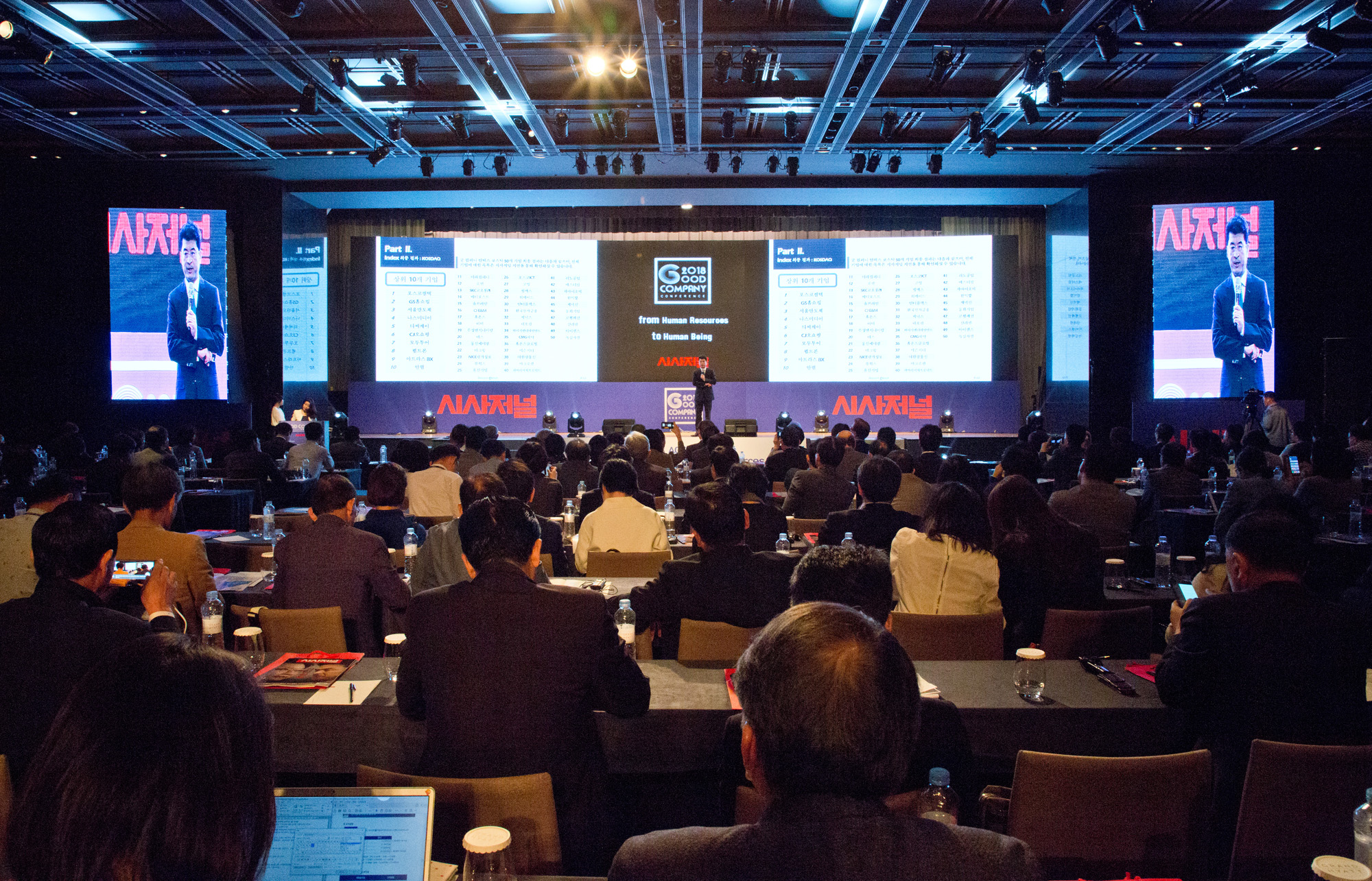 '2018 굿컴퍼니 컨퍼런스(GCC)'에서 인싸이트 그룹의 오승훈대표가 한국의 100대 굿컴퍼니를 발표 하고 있다.