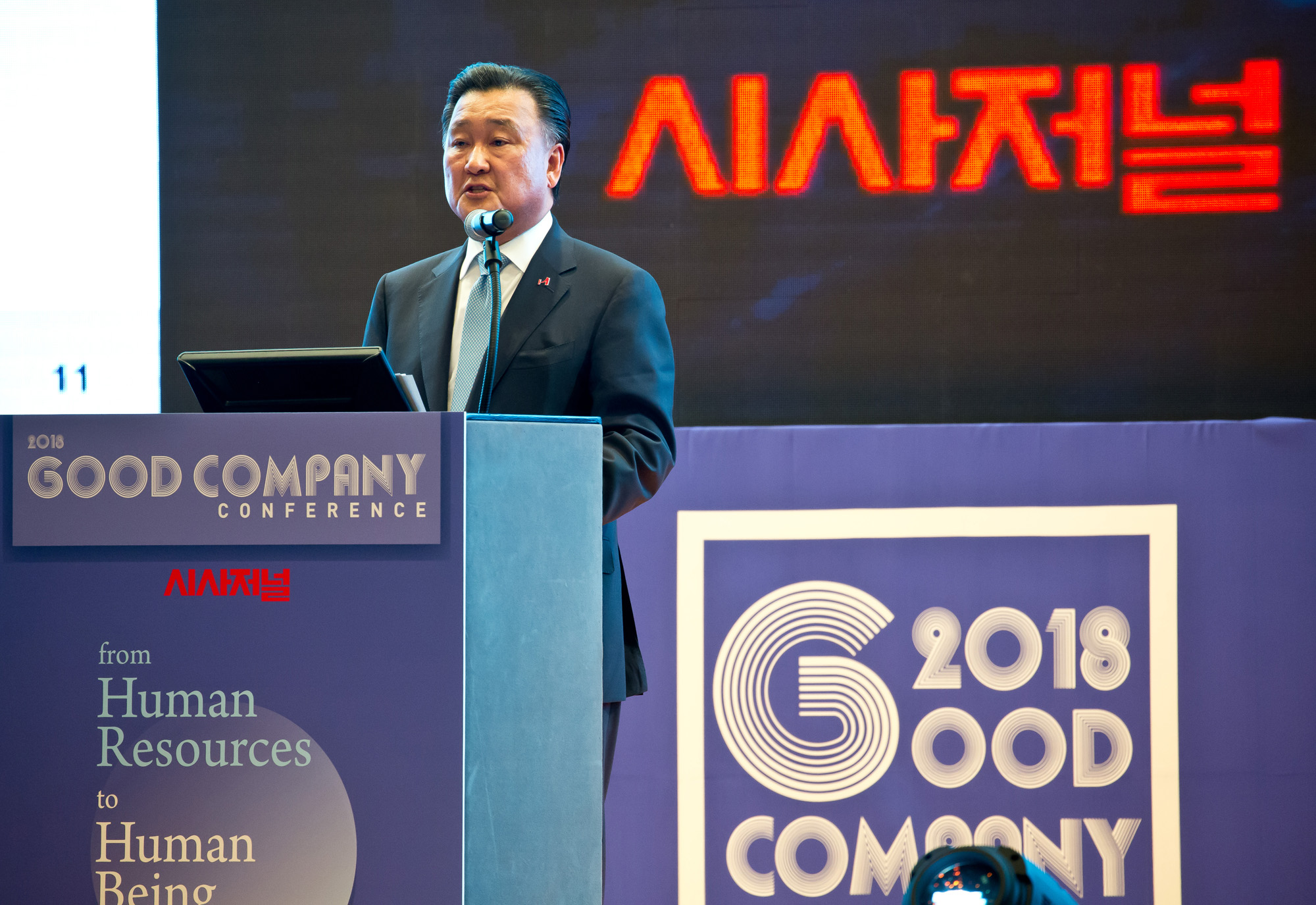 '2018 굿컴퍼니 컨퍼런스(GCC)'에서 한미은행 금종국 행장이 강연을 하고 있다.