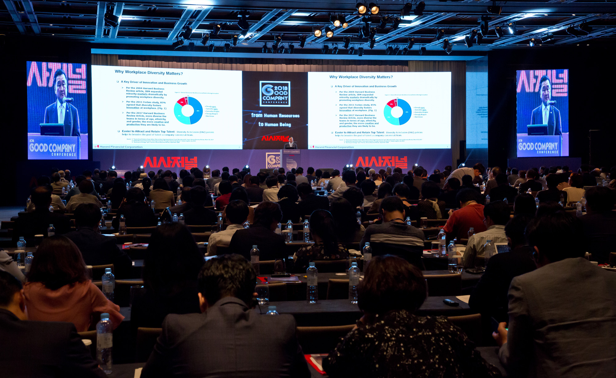 '2018 굿컴퍼니 컨퍼런스(GCC)'에서 한미은행 금종국 행장이 강연을 하고 있다.