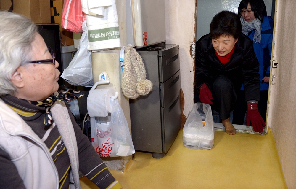 박근혜 대통령 당선인이 성탄절인 25일 서울 창신동 쪽방촌에서 직접 만든 도시락을 독거노인에게 전달하기 위해 방으로 들어서고 있다.