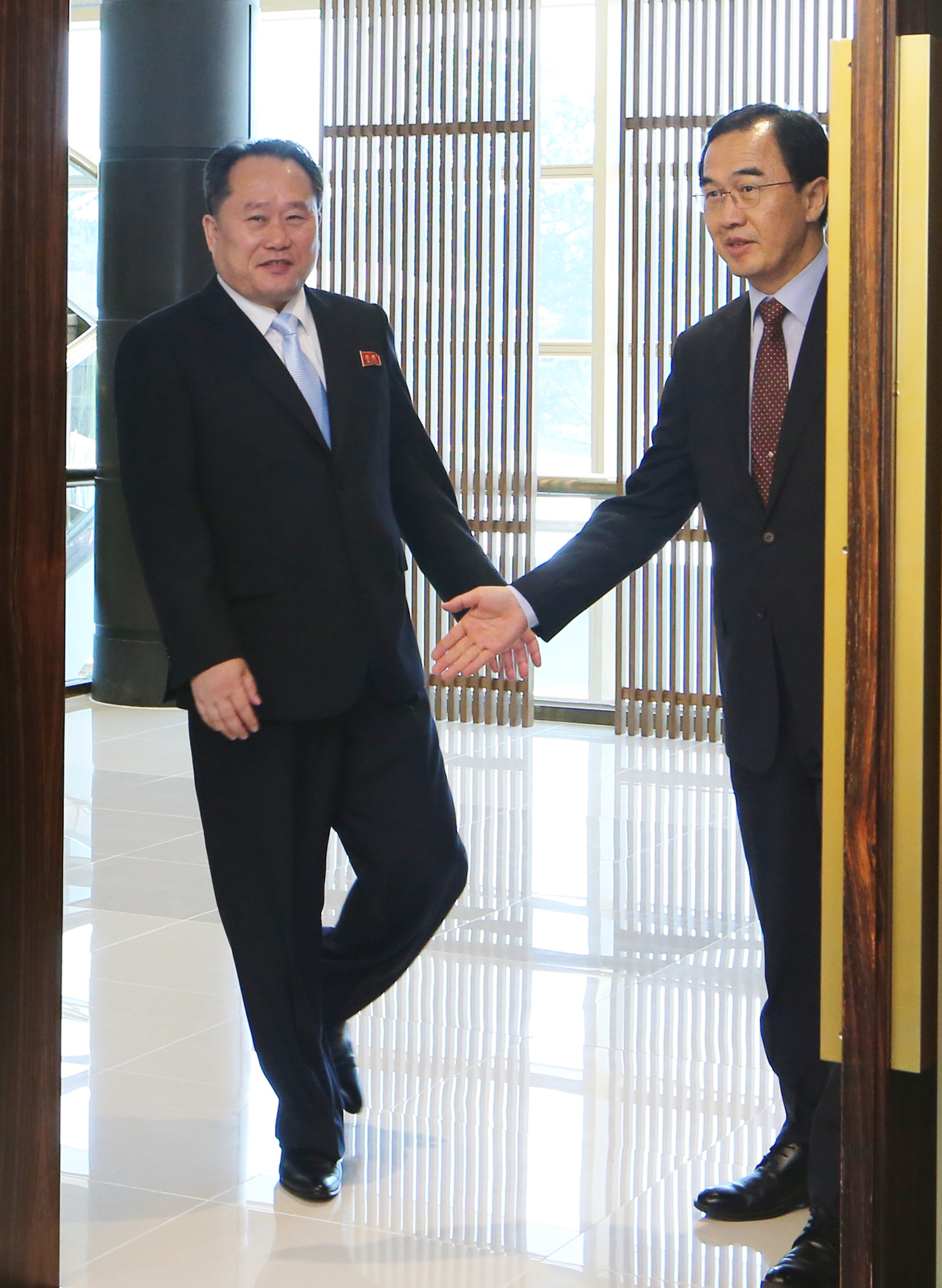 남·북 고위급회담 수석대표 조명균 통일부장관과 리선권 조국평화통일위원회(조평통) 위원장이 1일 오전 판문점 평화의집에서 열린 남북고위급회담을 위해 회담장에 들어서고 있다. 2018.06.01 사진공동취재단