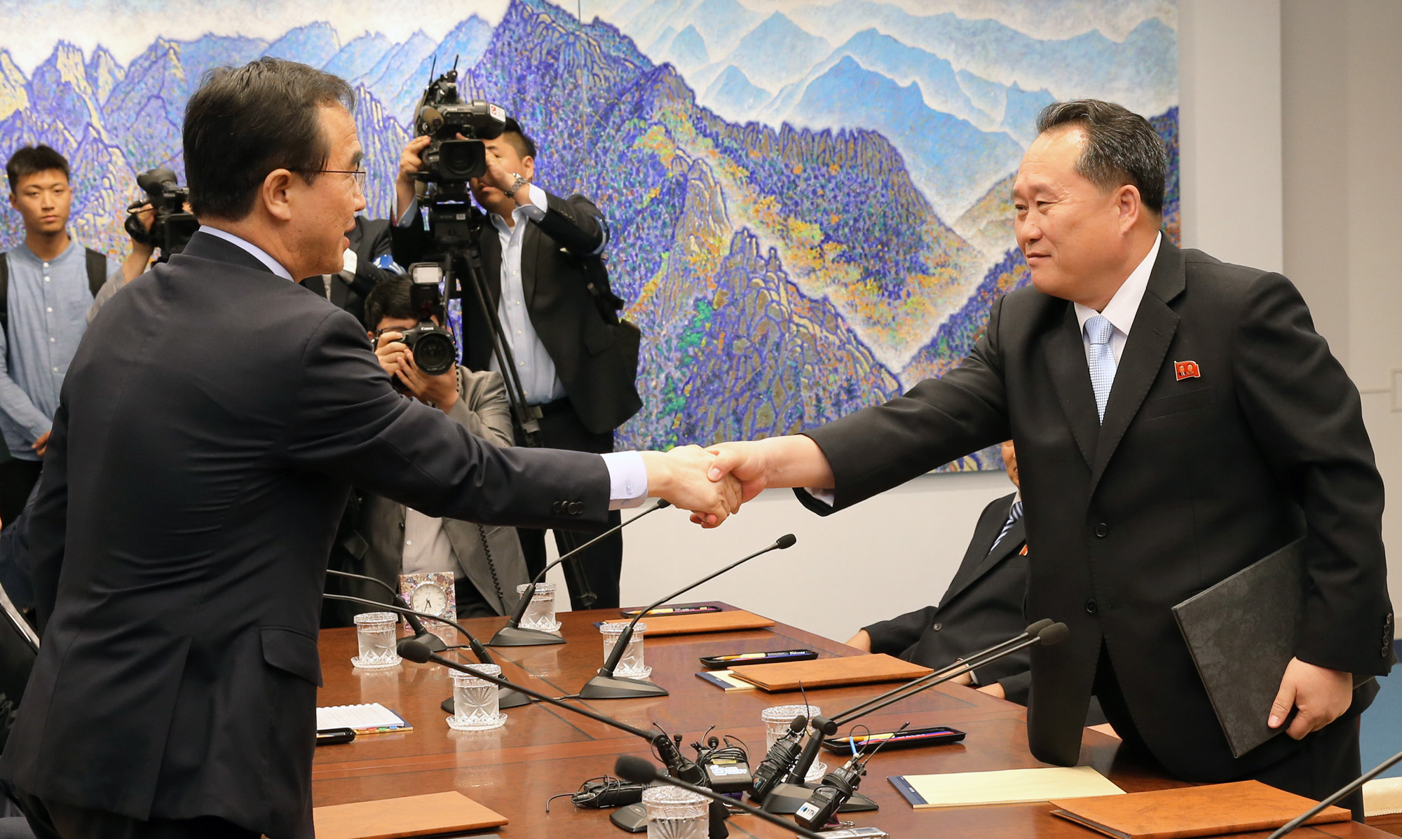 조명균 통일부장관과 리선권 조국평화통일위원회(조평통) 위원장이 1일 오후 판문점 평화의집에서 열린 남북고위급회담 종결회의에서 공동보도문을 교환하고 악수를 나누고 있다. 2018.06.01 사진공동취재단
