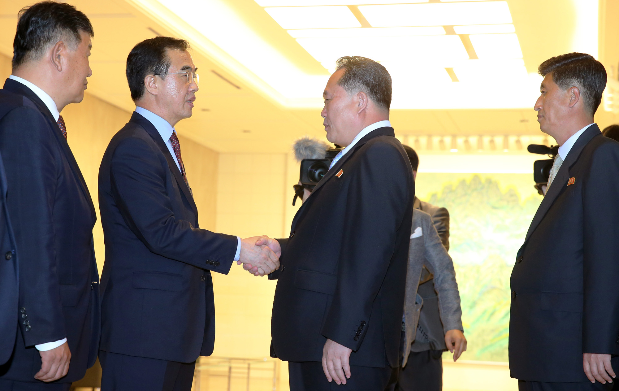 조명균 통일부장관과 리선권 조국평화통일위원회(조평통) 위원장이 1일 오후 판문점 평화의집에서 열린 남북고위급회담을 마치고 나와 악수를 하고 있다. 2018.06.01 사진공동취재단