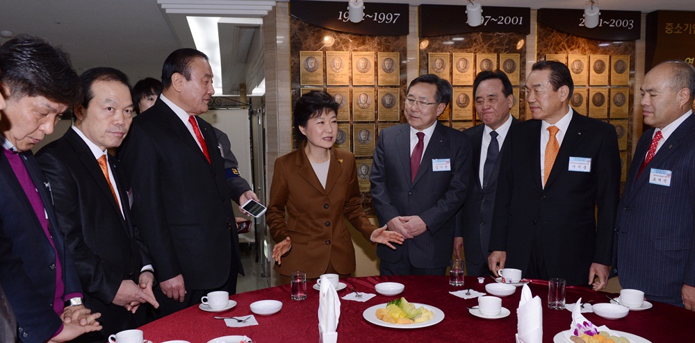 박근혜 대통령 당선인이 26일 서울 여의도 중소기업중앙회 대회의실에서 열린 '회장단과의 만남'에 앞서 가진 티타임에서 회장단에게 얘기를 하고 있다.