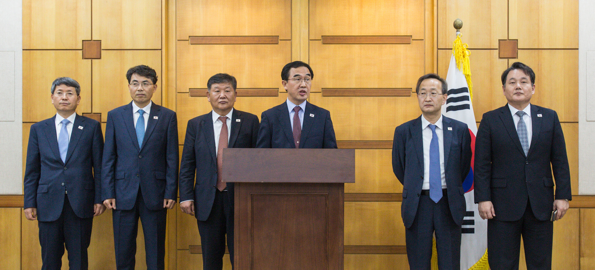 조명균 통일부 장관이 1일 오후 판문점 남측 평화의집에서 열린 '남북고위급회담'을 마친 뒤 브리핑하기 위해 기자회견장으로 들어서고 있다 2018.06.01 사진공동취재단