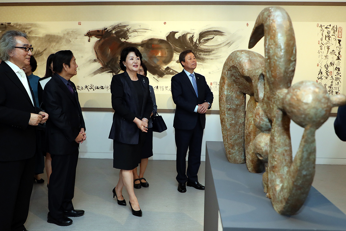 문재인 대통령 부인 김정숙 여사는 5일 오후 서울 예술의전당 서예박물관에서 열린 ‘한메이린 세계순회전-서울’ 개막식에 참석 하고 있다.