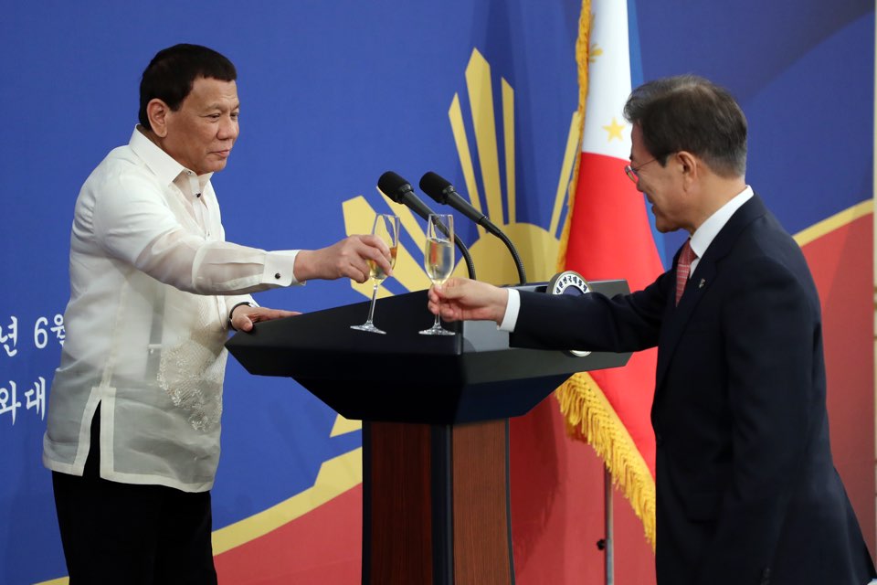 로드리고 두테르테 필리핀 대통령(좌)이 4일 오후 청와대에서 열린 공식만찬에서 문재인 대통령과 건배를 하고 있다.