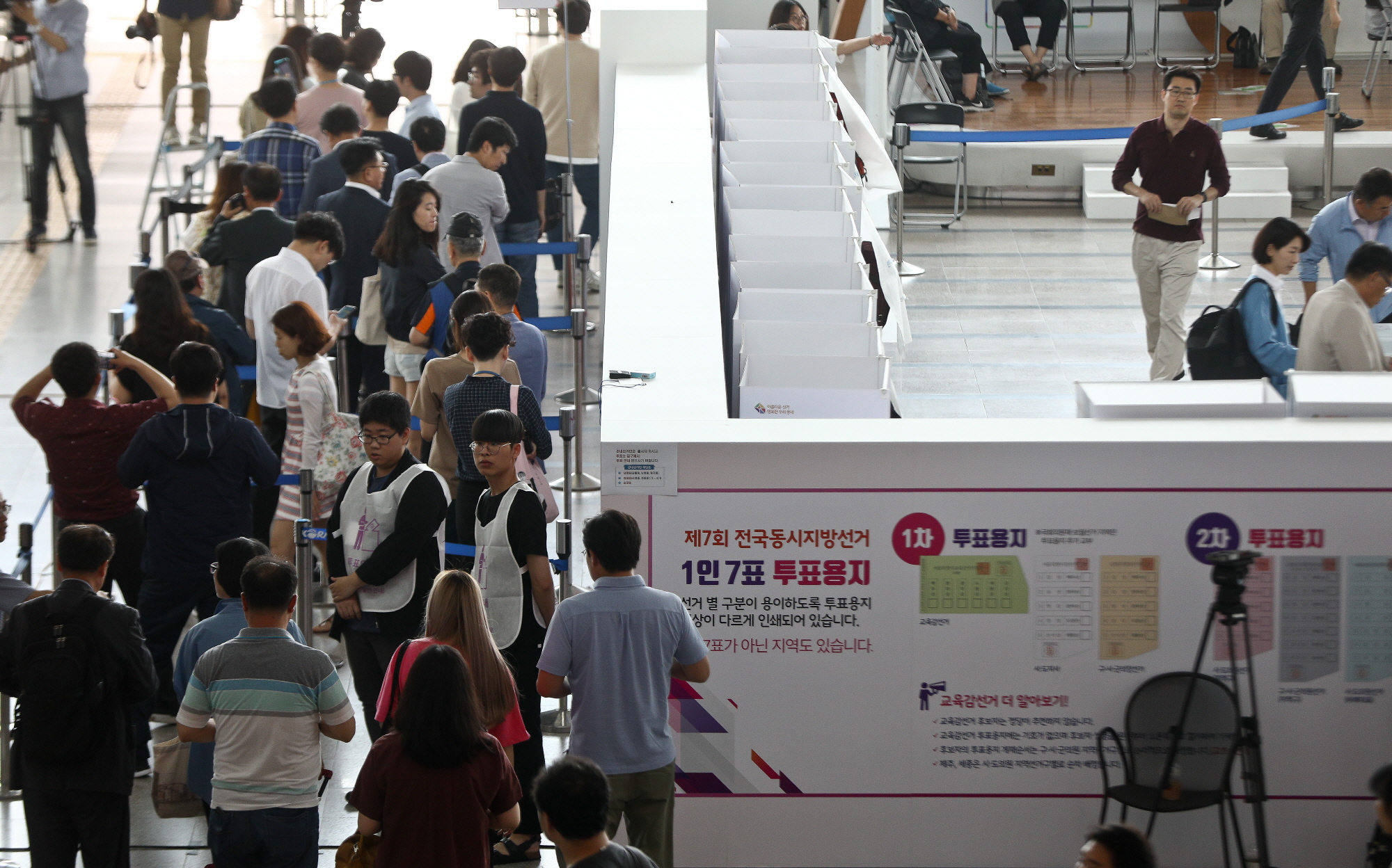 [서울=eoimage] 고성준 기자 = 제7회 전국동시지방선거 사전투표가 시작된 8일 서울 용산구 서울역 대합실에 마련된 사전투표소에서 시민들이 사전투표를 하고있다. 2018.6.8