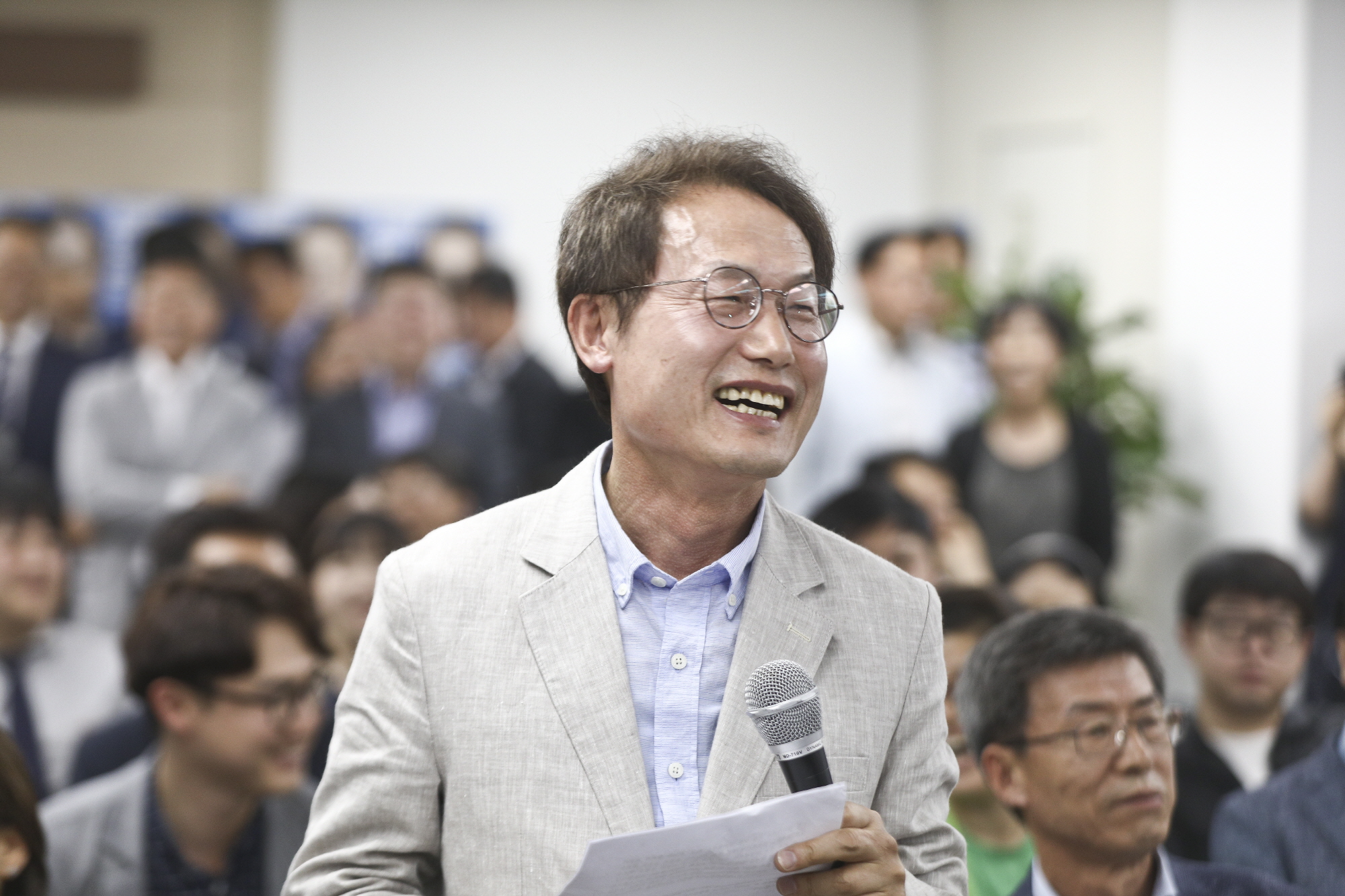 [서울=eoimage] 고성준 기자 = 조희연 서울시교육감 후보가 서울시 서대문구 선거사무실에서 당선 유력 결과가 나오자 지지자들에게 축하를 받고 있다. 2018.6.13