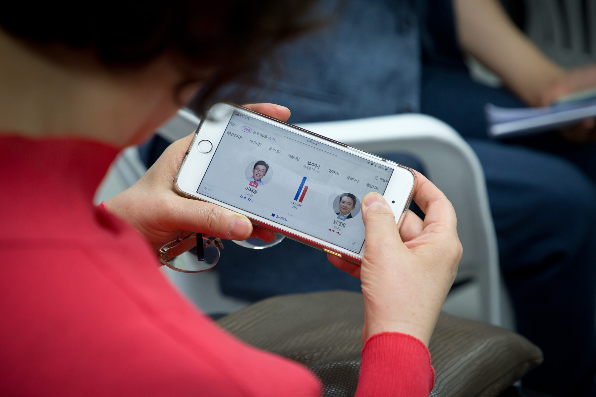 [수원=eoimage] (이오이미지) 임준선기자 = 13일 경기 수원시 팔달구에 마련된 이재명 경기도지사 선거사무소에서 한 지지자이 개표방송을 보고 있다.