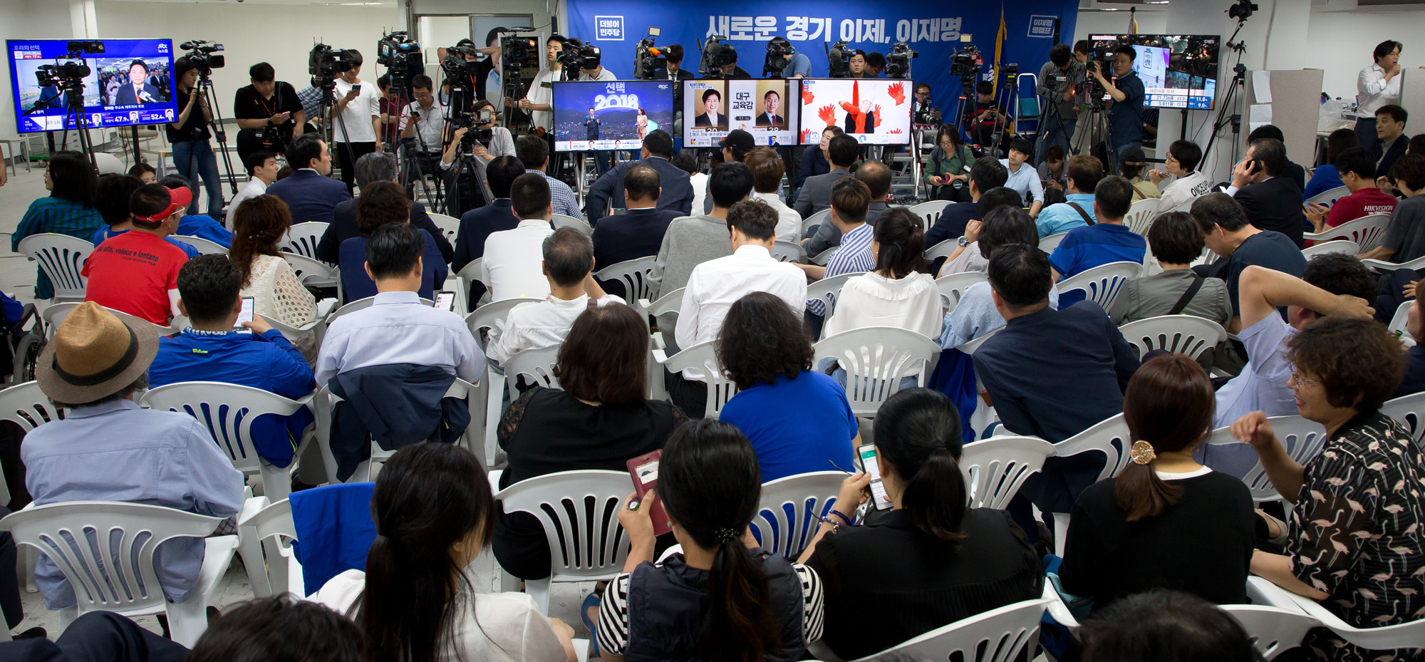 [수원=eoimage] (이오이미지) 임준선기자 = 13일 경기 수원시 팔달구에 마련된 이재명 경기도지사 선거사무소에서 지지자들이 개표방송을 보고 있다.