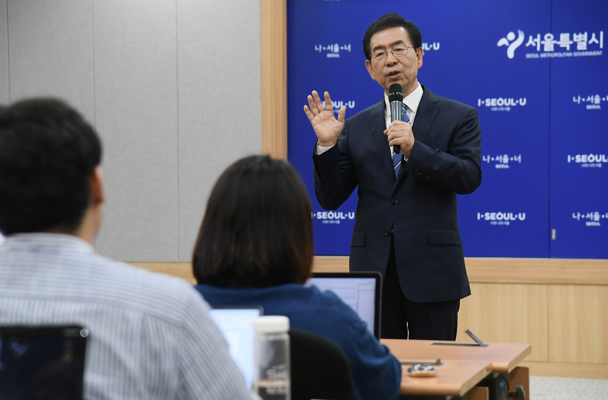 제7회 전국동시지방선거에서 3선에 성공한 박원순 서울시장이 14일 서울 중구 서울시청 기자실을 방문해 출입기자들과 인사하고 있다. 서울시 제공