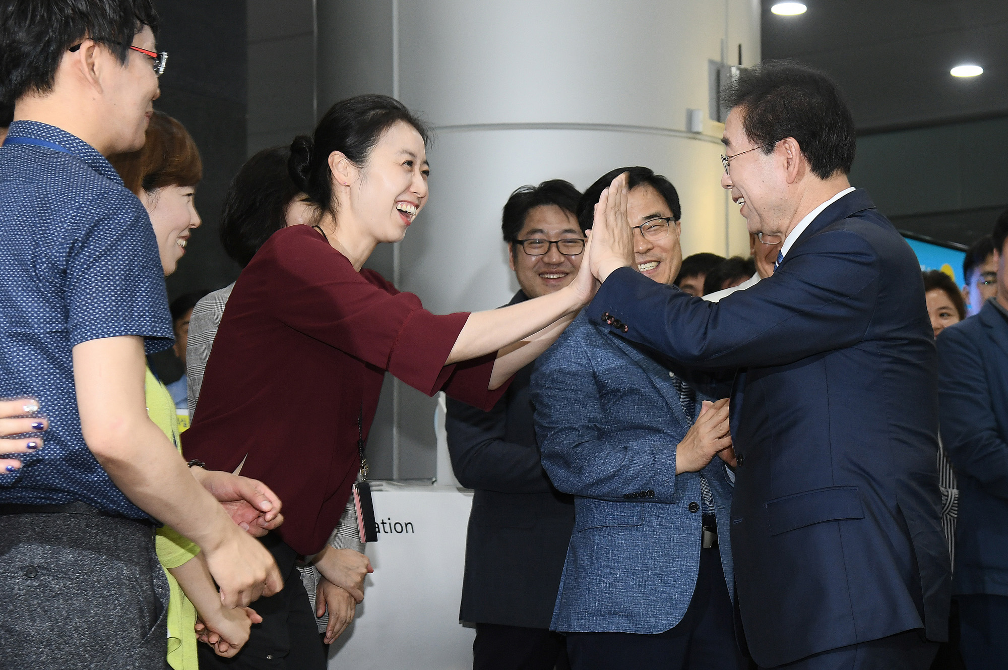 6·13 지방선거에서 역대 최초 3선에 성공한 박원순 서울시장이 14일 서울 중구 서울특별시청으로 출근하고 있다. 서울시 제공