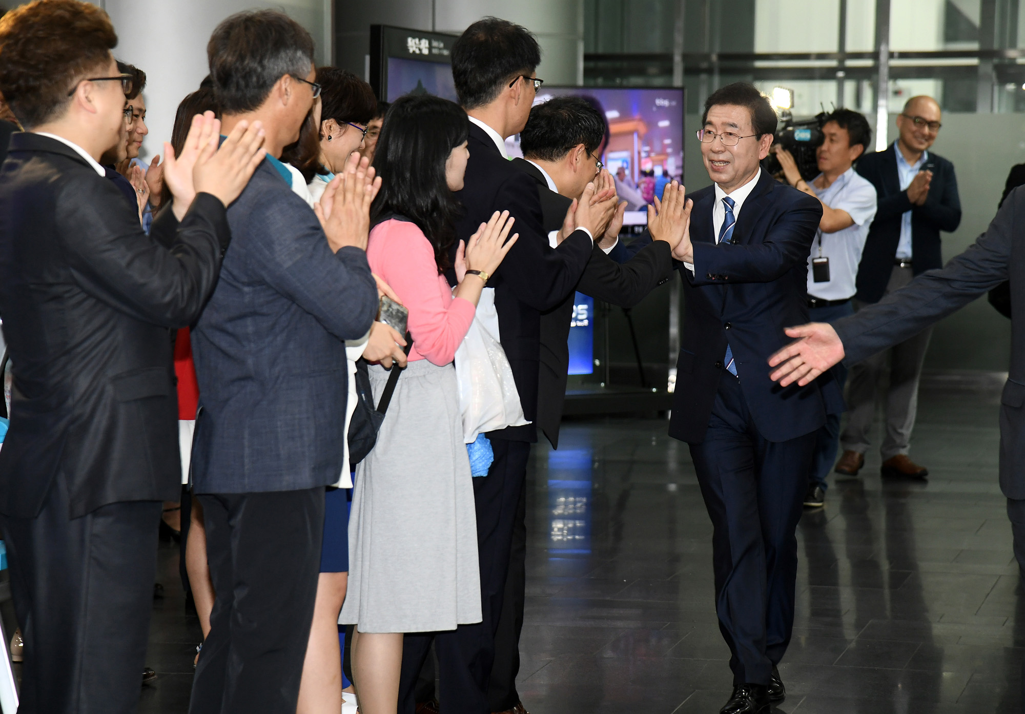 6·13 지방선거에서 역대 최초 3선에 성공한 박원순 서울시장이 14일 서울 중구 서울특별시청으로 출근하고 있다. 서울시 제공