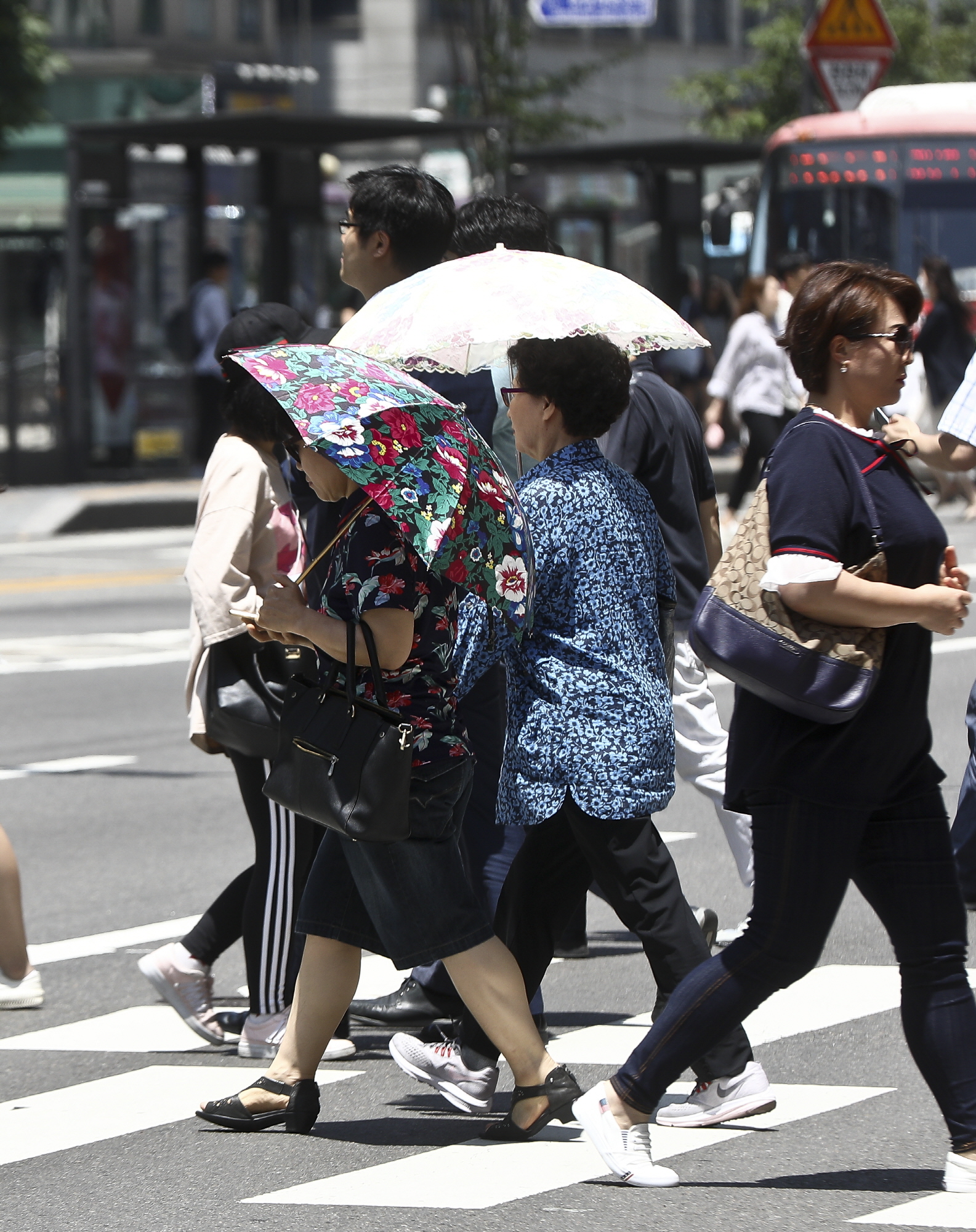 [서울=eoimage] 고성준 기자 = 하지를 맞은 21일 오후 서울 강남대로 일대를 지나는 시민들이 양산을 쓰고 햇볕을 피하고 있다. 2018.6.21