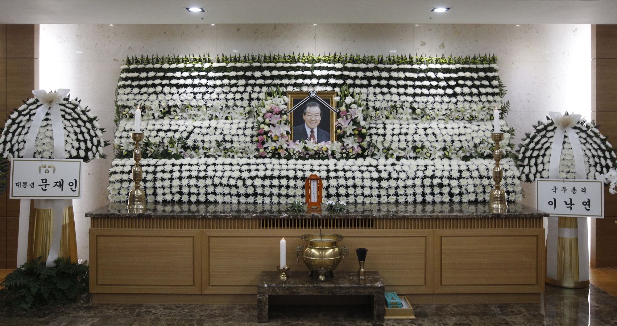 김종필(JP) 전 국무총리가 별세한 23일 현대 아산병원 장례식장에 마련된 빈소에 문재인 대통령과 이낙연 국무총리 화환이 놓혀있다. 김 전 총리는 이날 아침 서울 신당동 자택에서 호흡곤란 증세를 일으켜 순천향병원 응급실로 이송돼 심폐소생술을 받았으나 회복하지 못하고 숨졌다. 2018.06.23 사진 임준선 (현장풀) |
