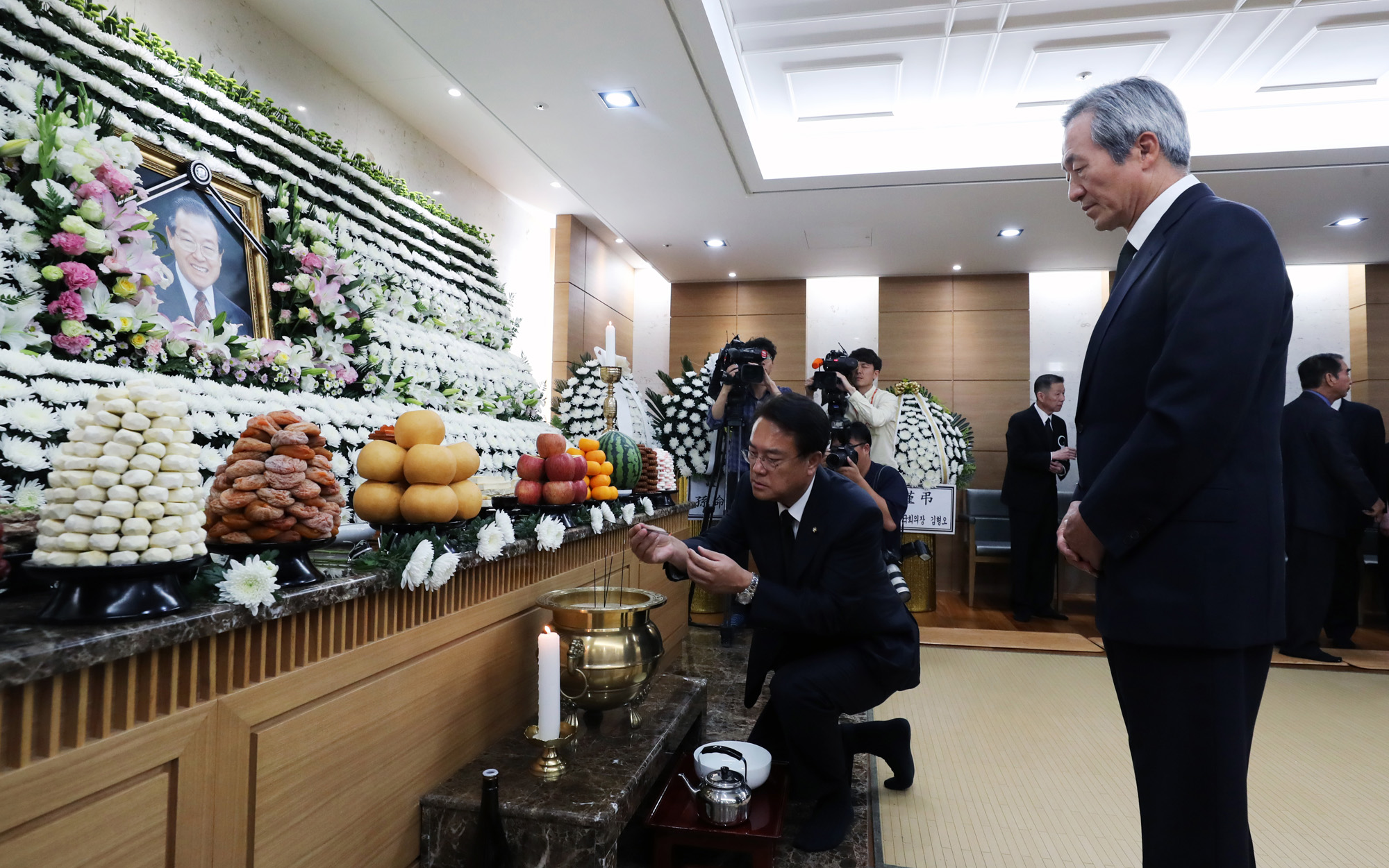 정몽준 아산재단 이사장과 정진석 자유한국당 의원이 23일 오후 별세한 김종필 전 국무총리의 빈소가 마련된 서울 송파구 서울아산병원 장례식장에서 조문을 하고 있다.