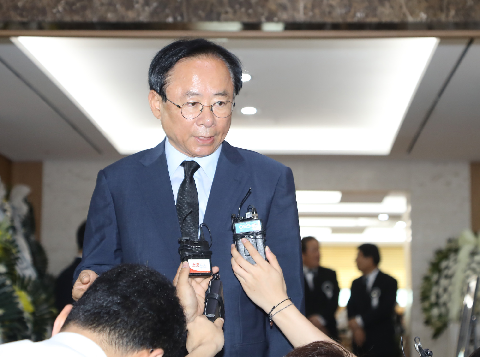 이주영 자유한국당 의원이 23일 오후 별세한 김종필 전 국무총리의 빈소가 마련된 서울 송파구 서울아산병원 장례식장에서 조문을 마치고 기자들의 질문에 답하고 있다.