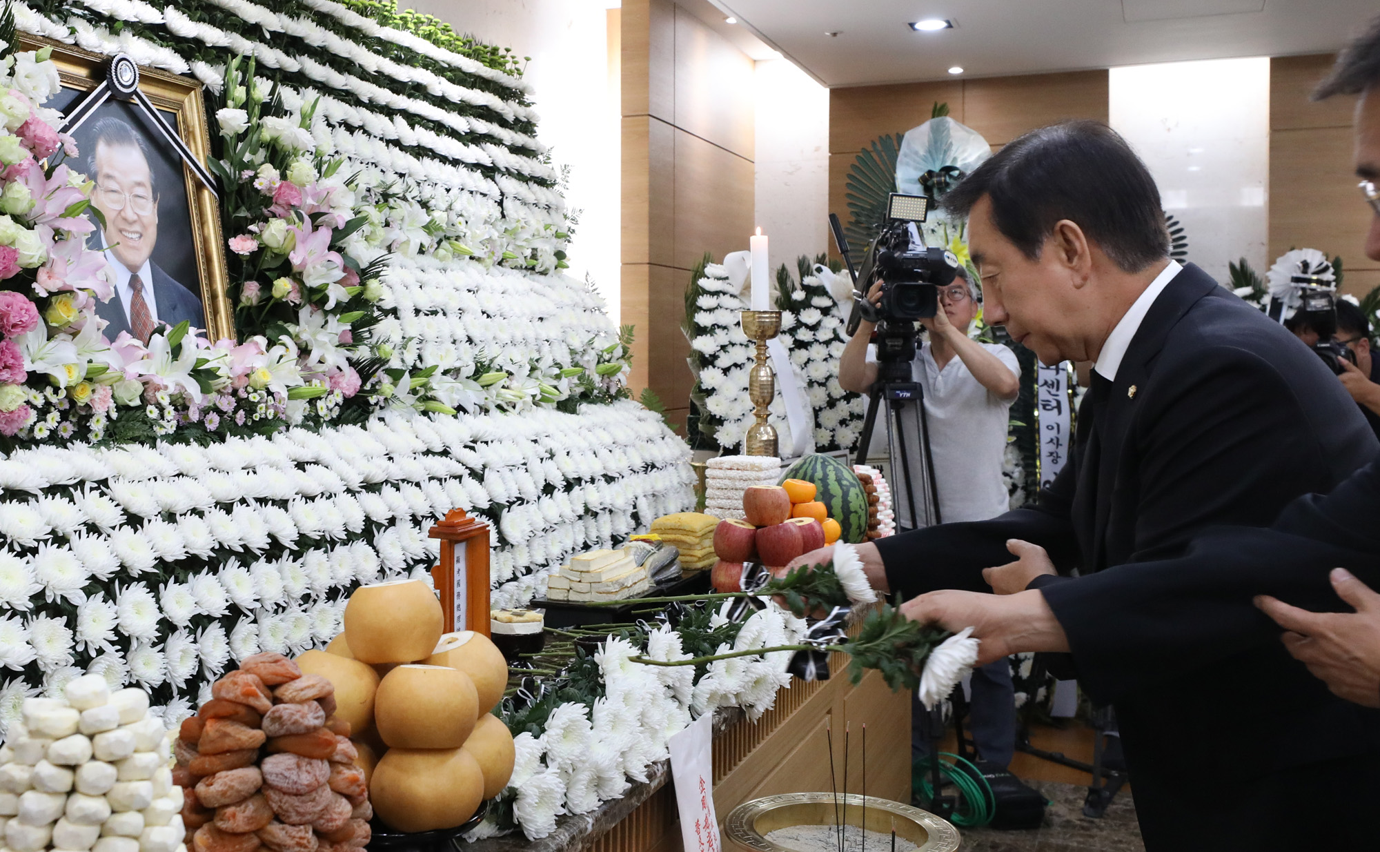 김성태 자유한국당 대표 권한대행이 23일 오후 별세한 김종필 전 국무총리의 빈소가 마련된 서울 송파구 서울아산병원 장례식장에서 조문을 하고 있다. 김 전 총리는 이날 아침 서울 신당동 자택에서 호흡곤란 증세를 일으켜 순천향병원 응급실로 이송돼 심폐소생술을 받았으나 회복하지 못하고 숨졌다.2018.06.23 사진/임준선기자(현장풀) |
