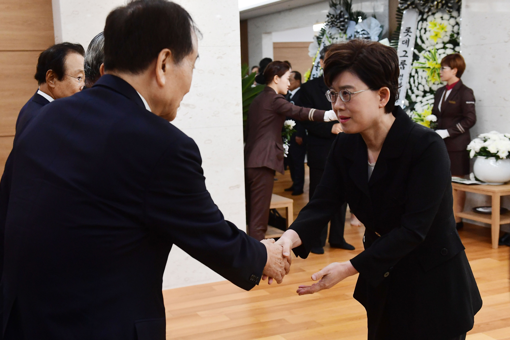 최연 자유한국당 의원이 23일 오후 서울 송파구 서울아산병원 장례식장에 마련된 김종필 전 국무총리의 빈소를 조문한 뒤 유가족과 인사를 나누고 있다. 2018.06.23