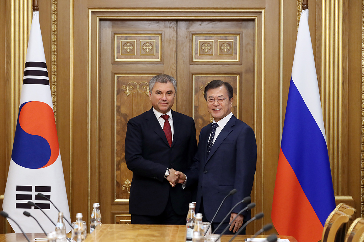 러시아를 국빈방문 중인 문재인 대통령은 21일 오후 모스크바에 도착한 직후 첫 일정으로 러시아 하원을 방문해 뱌체슬라프 볼로딘 하원의장을 면담했다.