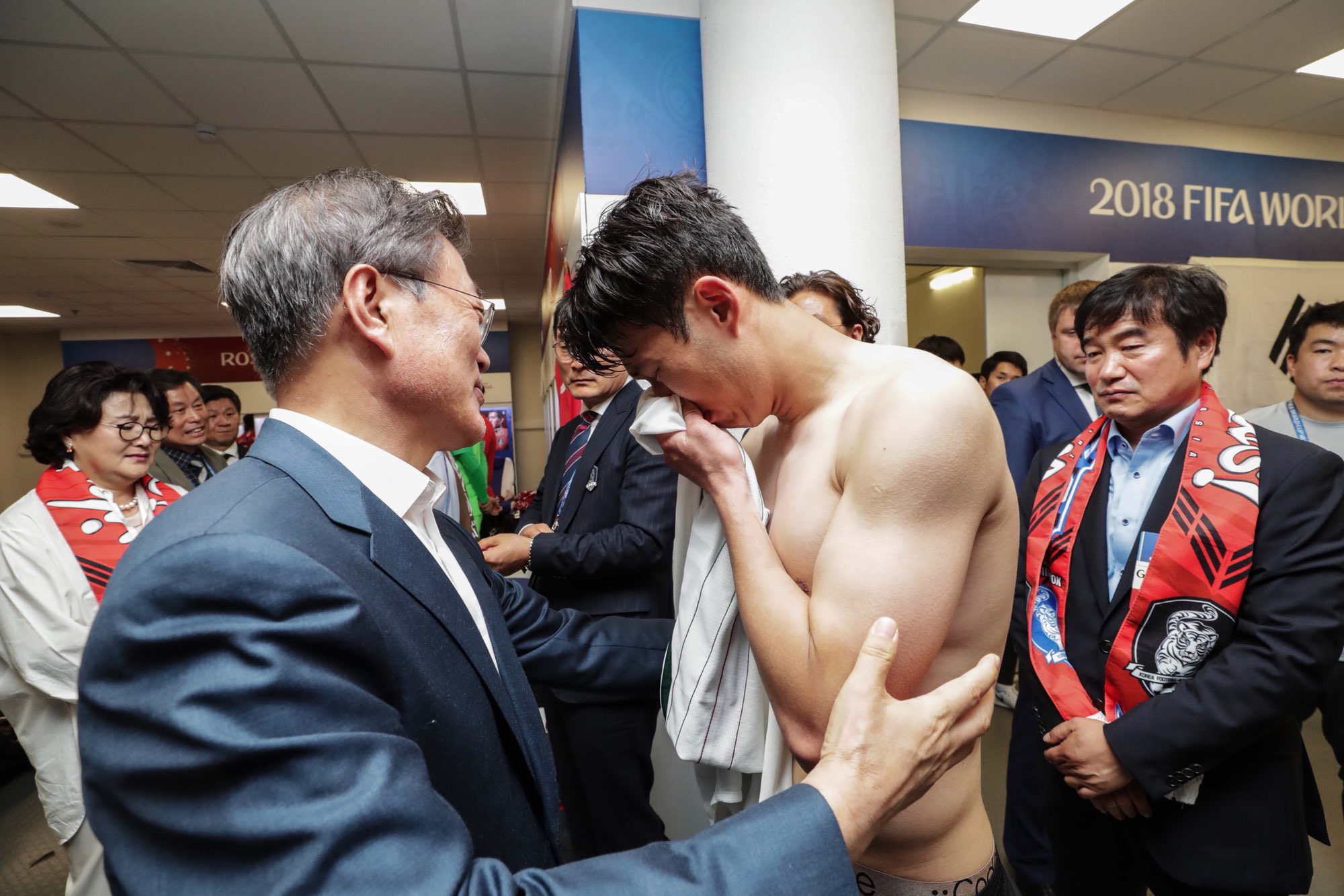 2018 러시아 월드컵 멕시코 전 패배 후 문재인 대통령이 울고 있는 손흥민 선수를 격려 하고 있다.