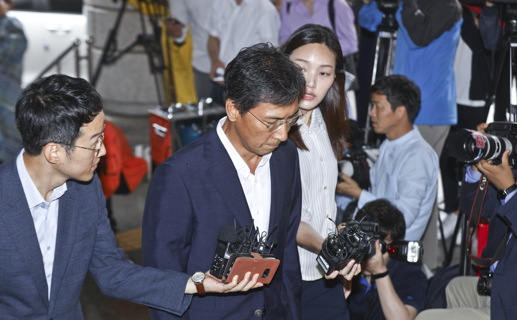 | 사진설명 | [서울=eoimage] 고성준 기자 = '비서 성폭행' 혐의를 받고있는 안희정 전 충남도지사가 2일 오전 서울 마포구 서울서부지방법원에서 열린 첫 재판을 위해 출석하고 있다. 안 전 지사는 지난해 7월부터 7개월에 걸쳐 정무비서이자 수행비서였던 김지은씨(33)를 4차례 성폭행한 혐의로 재판에 넘겨졌다. 2018.7.2 |