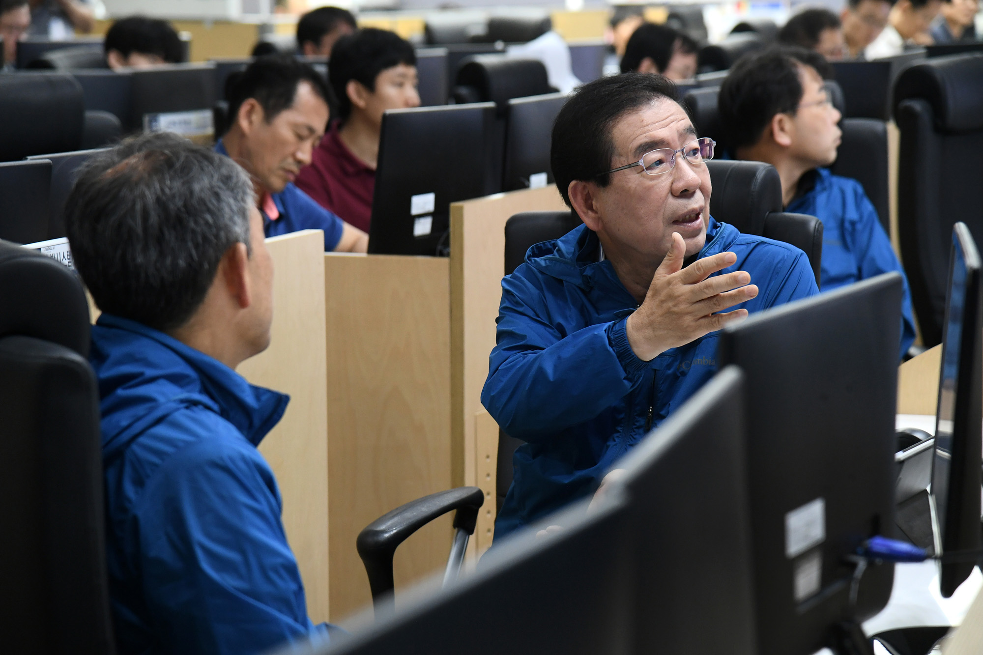 박원순 서울시장이 1일 서울 중구 서울시청 수방상황실에서 전화를 통해 자치구 구청장들에게 철저한 수방대비를 주문하고 있다. 서울시 제공