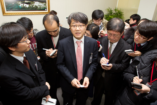 제18대 대통령직 인수위원회 김용준 위원장은 18일 오후 2시 서울 삼청동 한국금융연수원에 마련된 인수위에서 출입기자들과 간담회를 갖었다. 이자리에서 강석훈 국정기획분과위원이 기자들과 이야기를 나누고 있다./ 인수위사진기자단