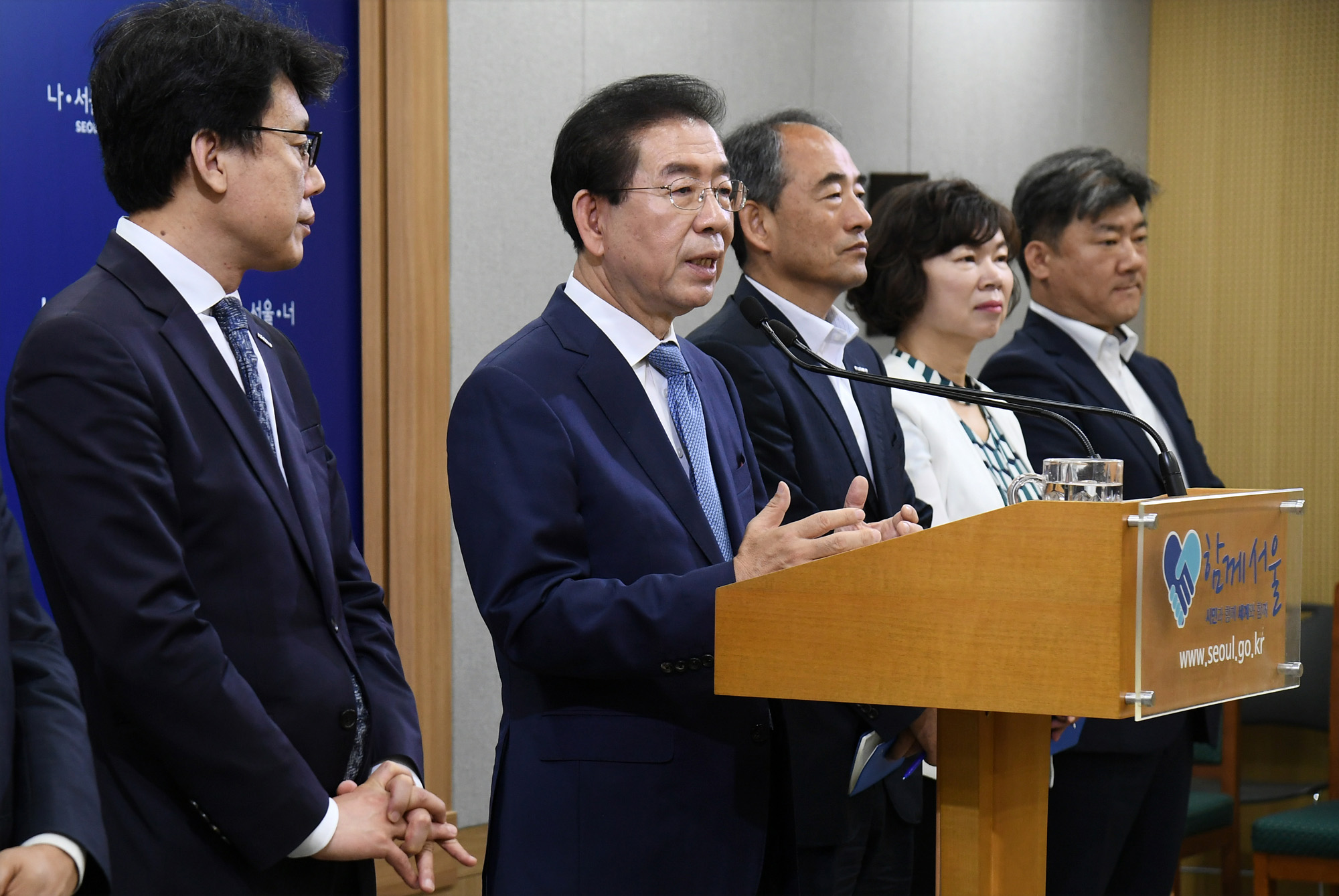 3선에 성공한 박원순 서울시장이 2일 오전 서울 중구 서울시청 브리핑실에서 열린 취임 기자회견에서 취임사를 하고 있다. 서울시 제공