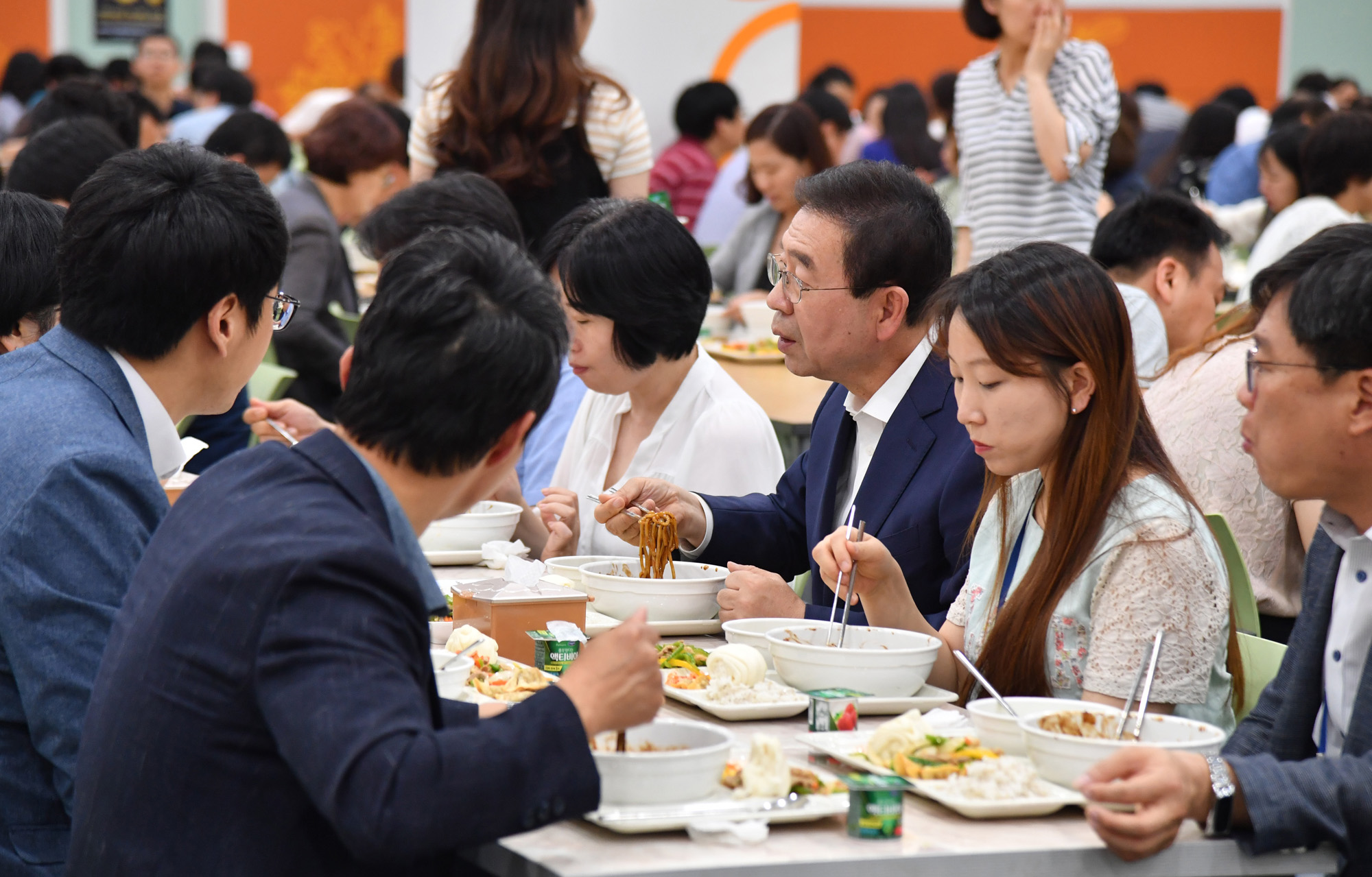 박원순 서울시장이 2일 오후 서울시청 구내식당을 찾아 직원들과 함께 식사하고 있다. 서울시 제공