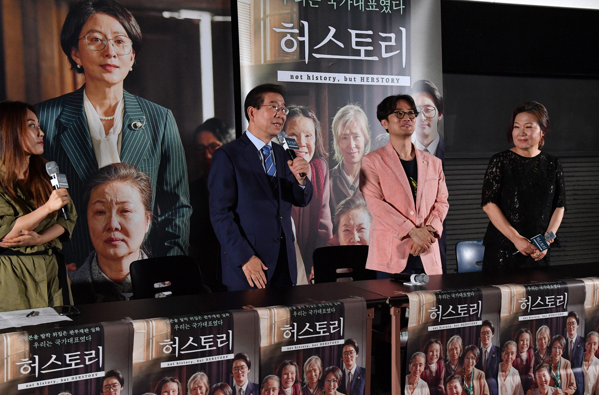 박원순 서울시장이 3일 오후 7시30분 왕십리CGV에서 '일본군 위안부'를 소재로 한 영화 '허스토리'를 일반관객들과 함께 관람하고 있다. 서울시 제공