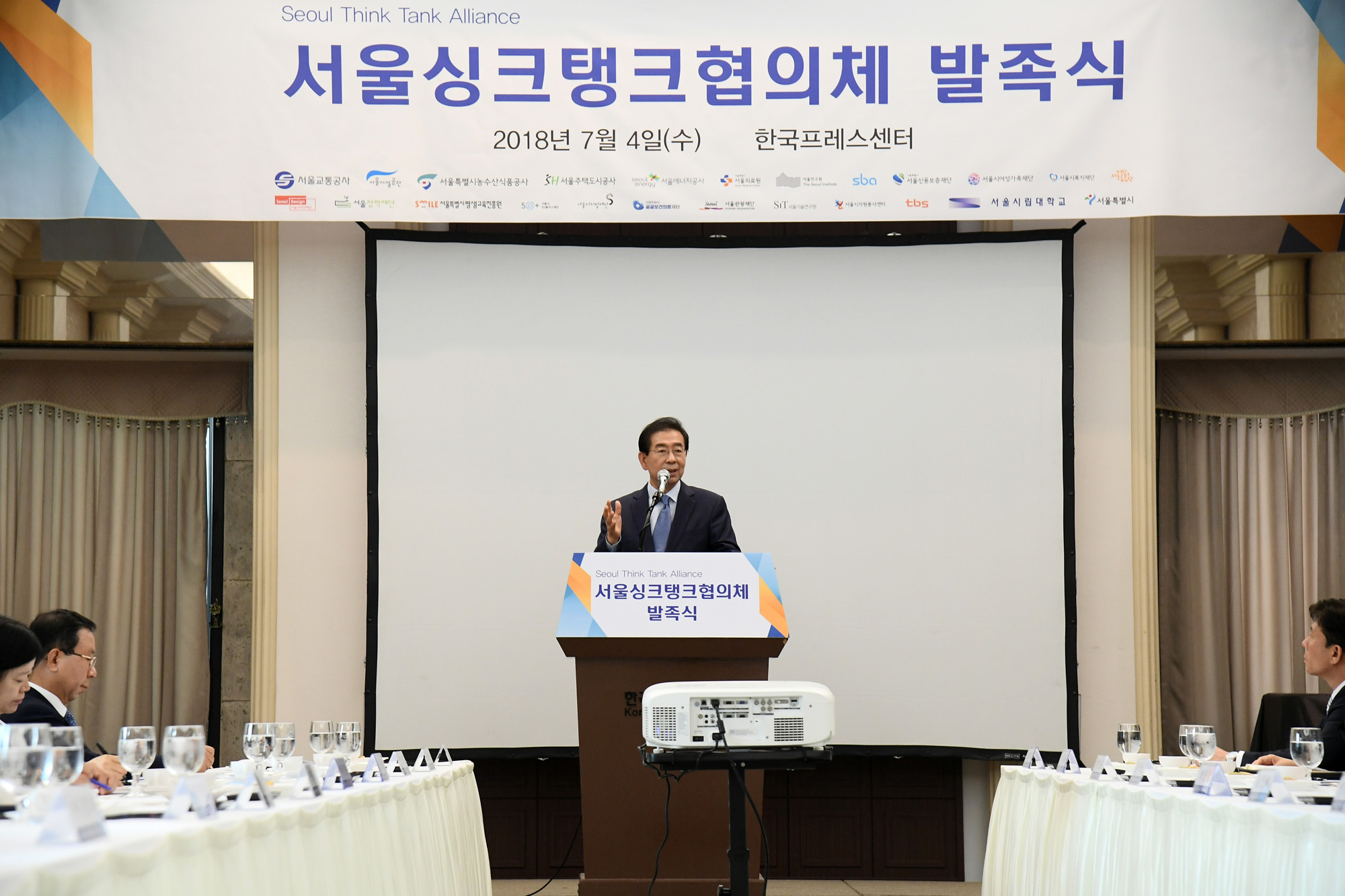박원순 서울시장이 4일 서울 중구 프레스센터에서 열린 서울싱크탱크협의체(SeTTA) 발족식에서 격려사를 하고 있다. 서울시 제공