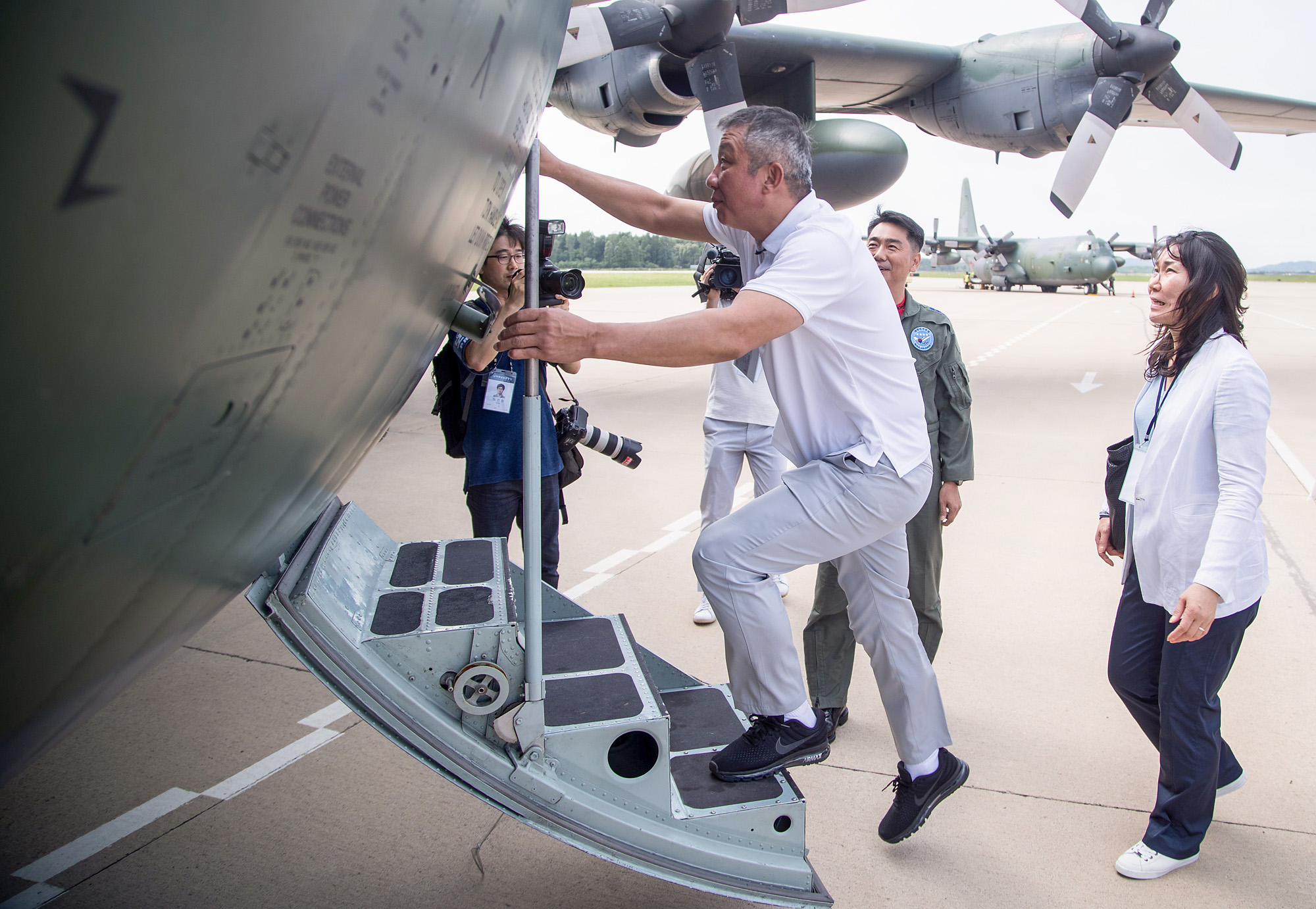 허재 남자 농구대표팀 감독이 6일 오후 평양 순안 공항에서 남북통일농구경기 모든 일정을 마치고 서울로 가는 군 수송기에 탑승하고 있다. 2018.7.6 사진공동취재단 / 오마이뉴스 이희훈 기자