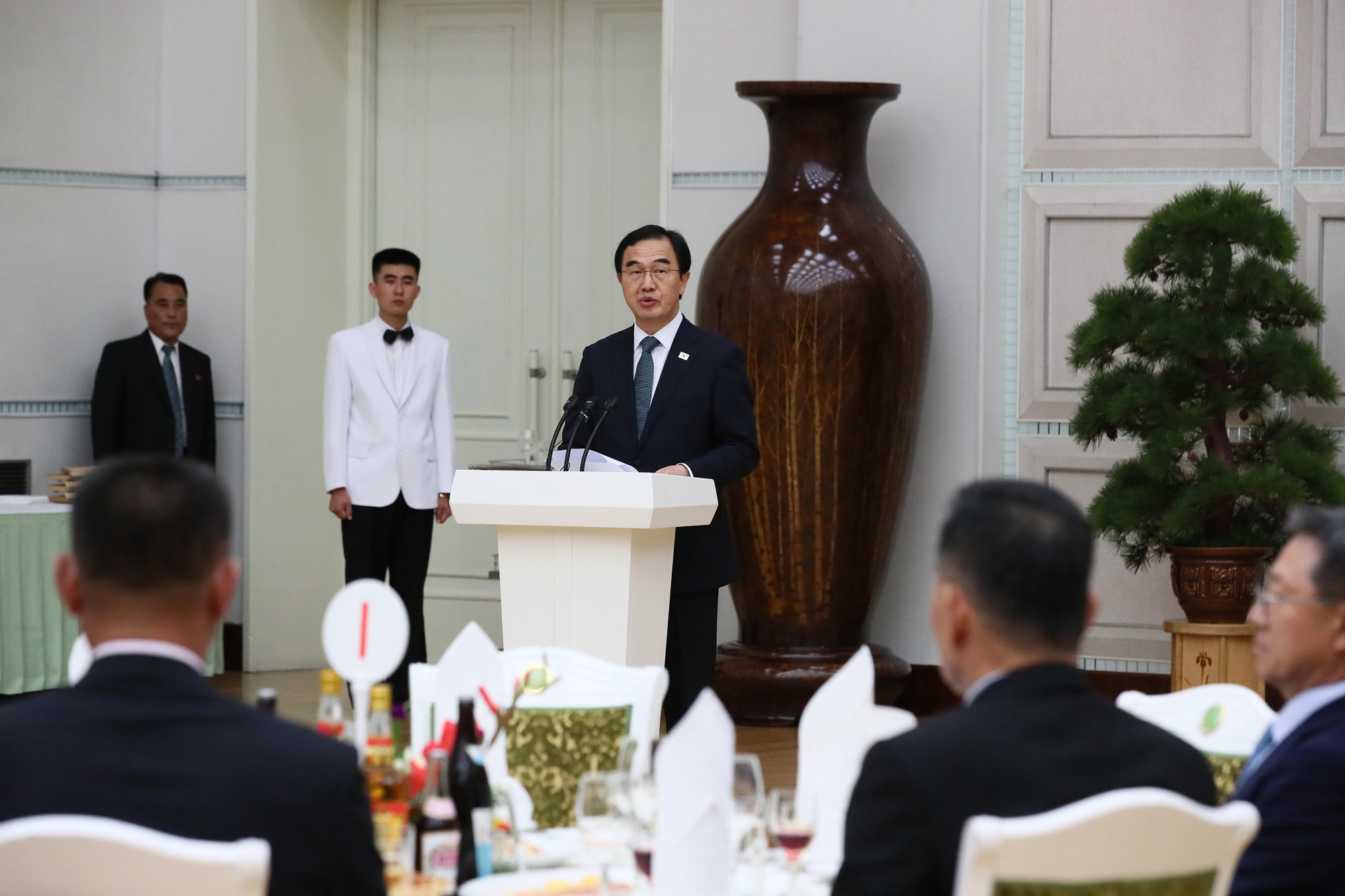 조명균 통일부 장관이 5일 오후 평양 인민문화궁전에서 열린 환송만찬에서 답사를 하고 있다. 2018.07.05 사진공동취재단/이데일리 노진환