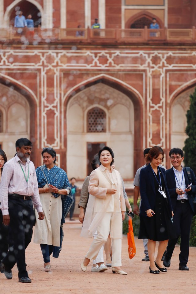 인도를 국빈 방문 중인 문재인 대통령 부인 김정숙 여사는 현지시간 9일 오후 인도의 대표적인 이슬람 문화유산인 ‘후마윤 묘지’를 둘러 보고 있다. 2018.07.09