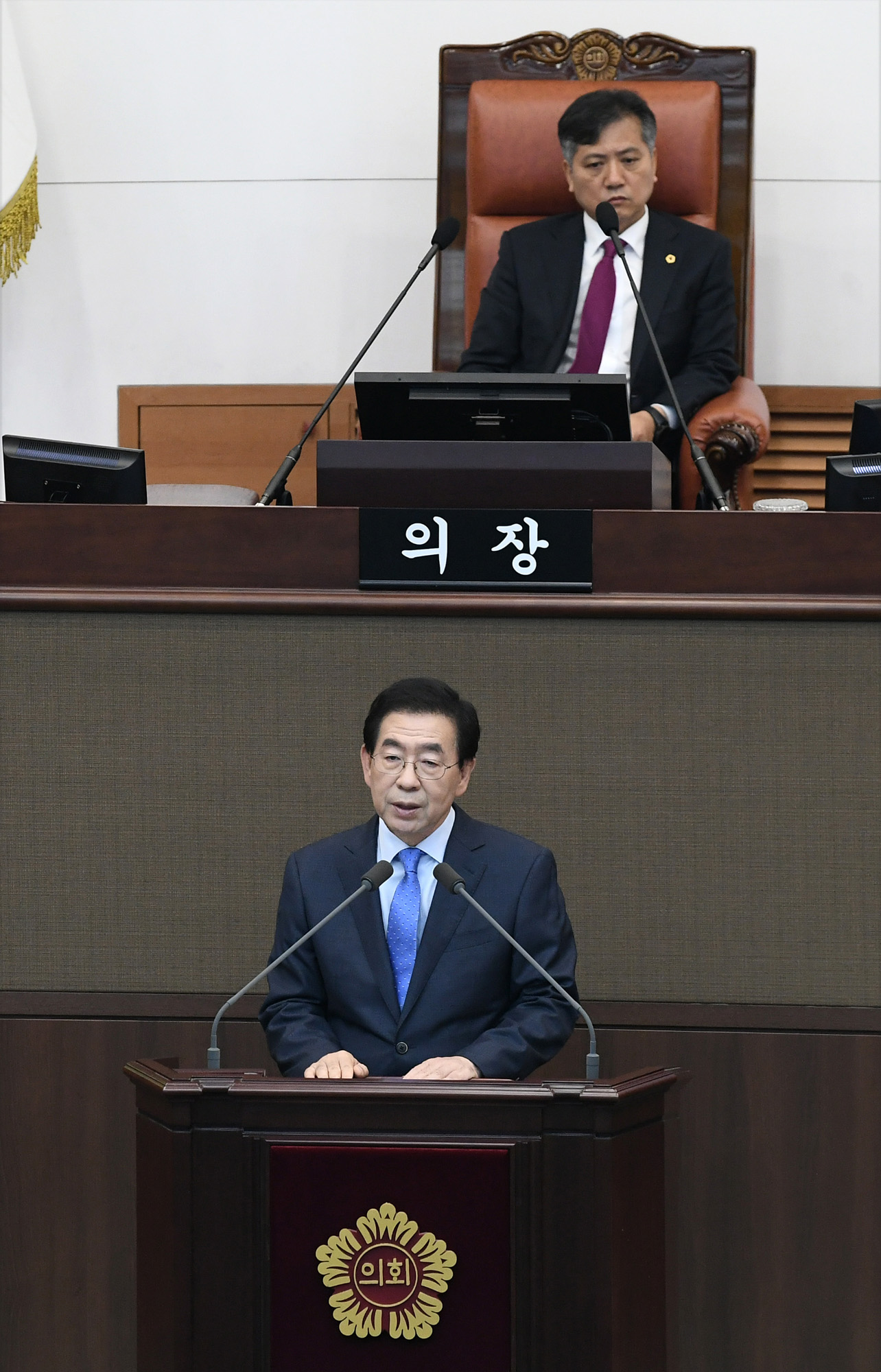 박원순 서울시장이 11일 오후 서울 중구 세종대로 서울시의회에서 열린 제10대 서울시의회 개원식 겸 제282회 임시회 개회식에서 축사를 하고 있다. 서울시 제공