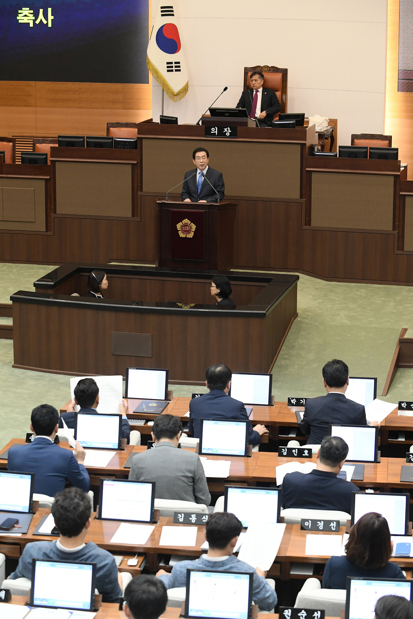 박원순 서울시장이 11일 오후 서울 중구 세종대로 서울시의회에서 열린 제10대 서울시의회 개원식 겸 제282회 임시회 개회식에서 축사를 하고 있다. 서울시 제공