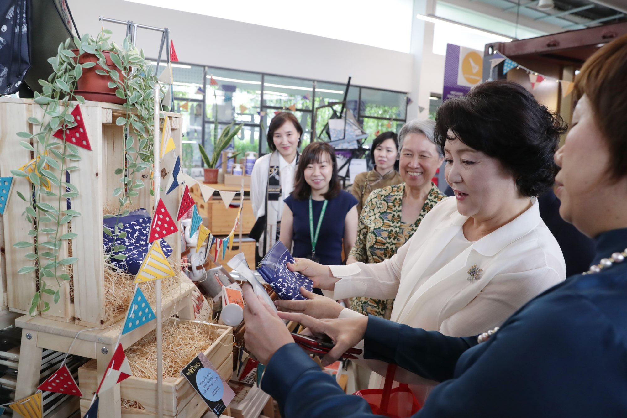싱가포르를 국빈 방문 중인 문재인 대통령 부인 김정숙 여사가 12일 낮 리센룽 총리 부인 호칭 여사와 함께 싱가포르의 장애인 사회통합 지원센터인 ‘이네이블링 빌리지’(Enabling Village)를 방문, 구 걱 분 대표로부터 시설에 대한 설명을 듣고 있다.