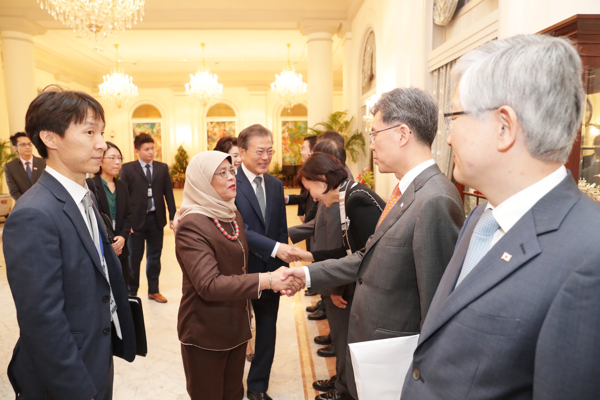싱가포르를 국빈 방문한 문재인 대통령이 12일 오전(현지시각) 싱가포르 대통령궁(이스타나, Istana)에서 열린 공식 환영식에 참석하고 있다.