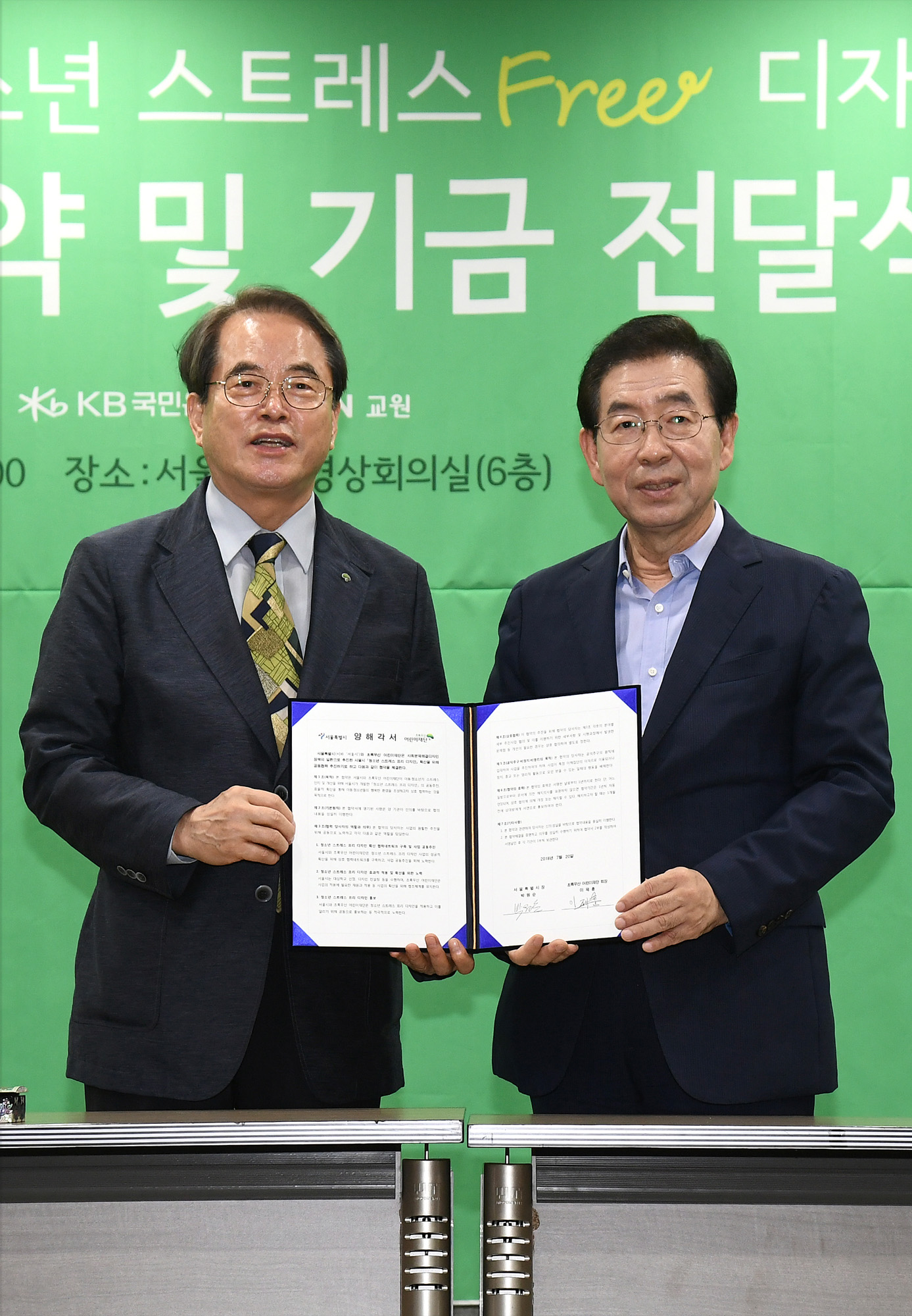 윤미영(왼쪽부터) 교원그룹 미래콘텐츠연구실장과 이제훈 초록우산 어린이재단 회장, 박원순 서울시장이 지난 20일 서울시청에서 ‘스트레스 프리존’ 조성 업무협약식을 진행하고 있다. 서울시 제공
