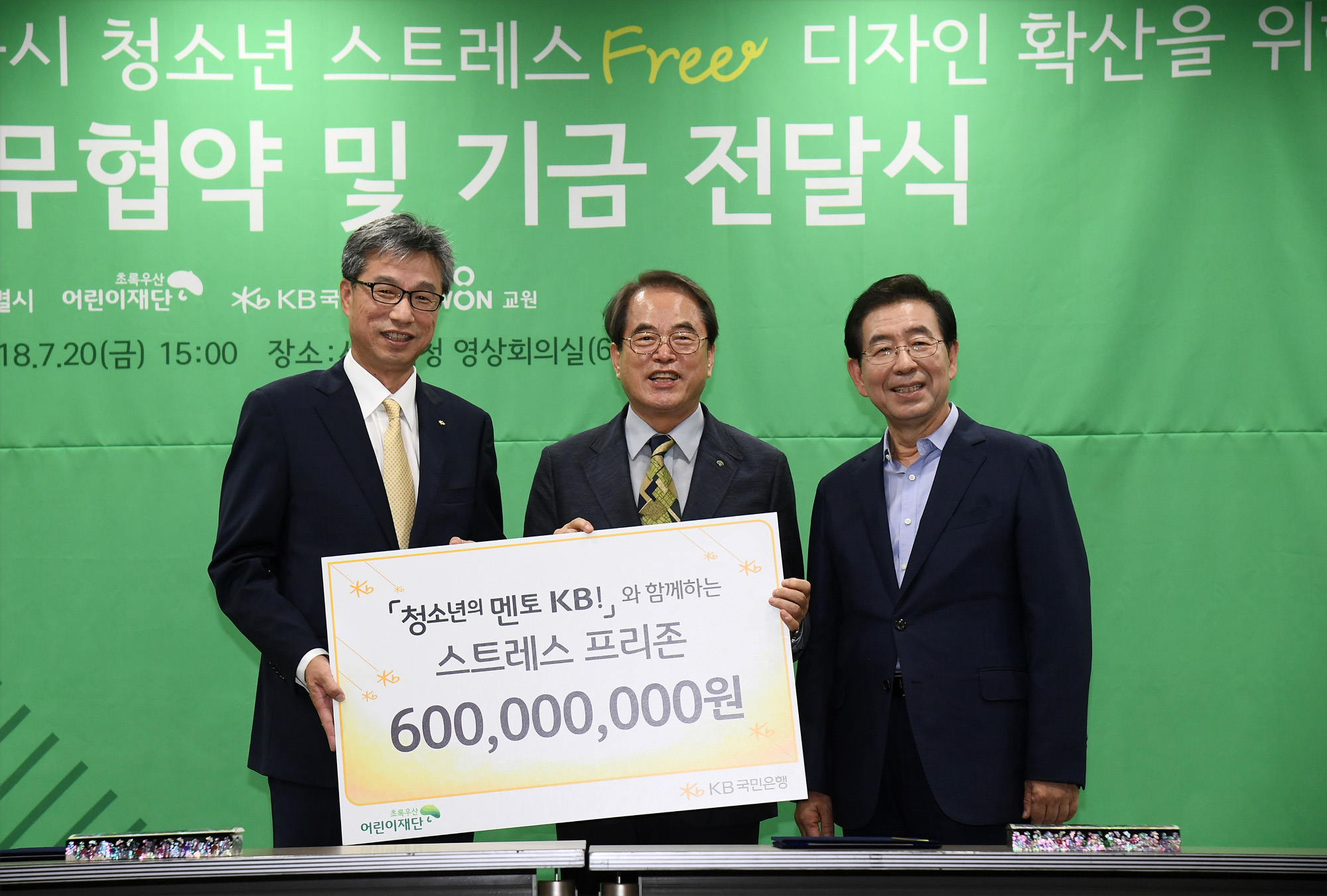 윤미영(왼쪽부터) 교원그룹 미래콘텐츠연구실장과 이제훈 초록우산 어린이재단 회장, 박원순 서울시장이 지난 20일 서울시청에서 ‘스트레스 프리존’ 조성 업무협약식을 진행하고 있다. 서울시 제공
