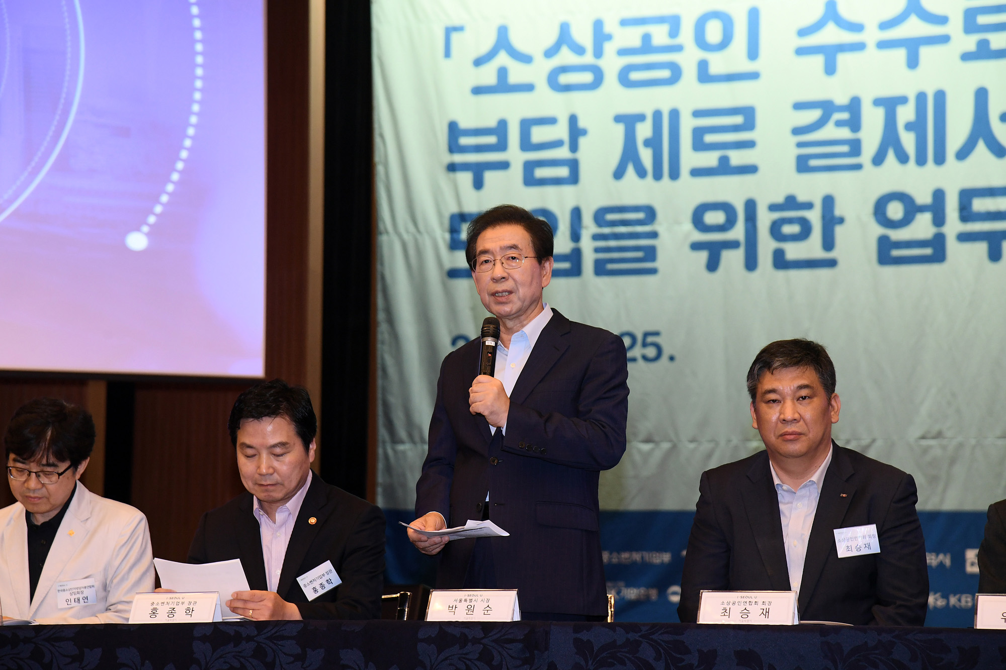 25일 서울 중구 대한상공회의소에서 열린 '소상공인 수수료 부담 제로 결제서비스' 도입을 위한 업무협약식에서 홍종학 중소벤처기업부 장관 박원순 서울시장이 카드수수료인하 서명부를 전달받은 뒤 기념촬영을 하고 있다. 서울시 제공