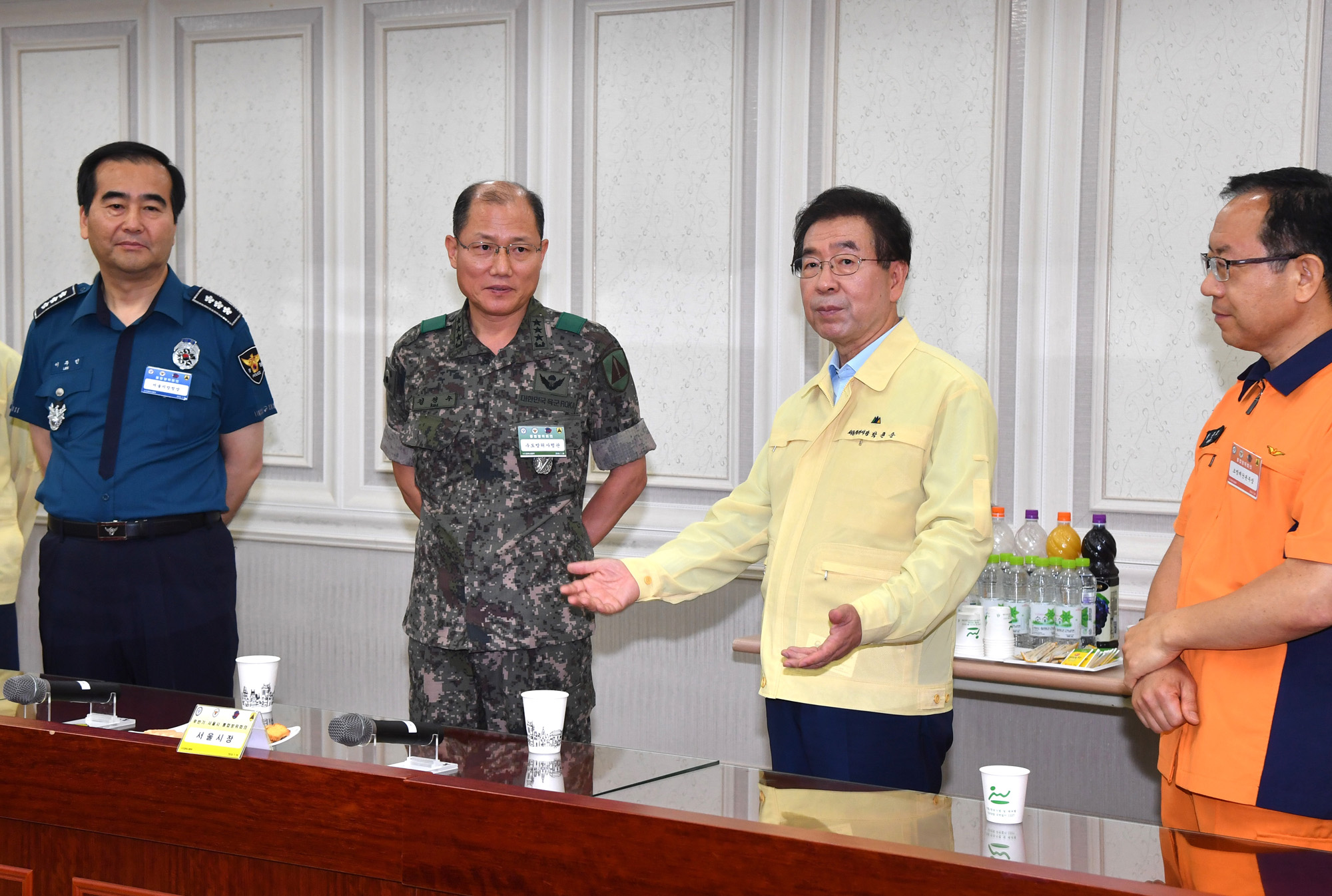 박원순 서울시장이 26일 오전 서울 수도방위사령부에서 열린 '2018년 하반기 서울시 통합방위회의'에서 김정수 수도방위사령관에게 감사패를 전달하고 있다. 서울시 제공