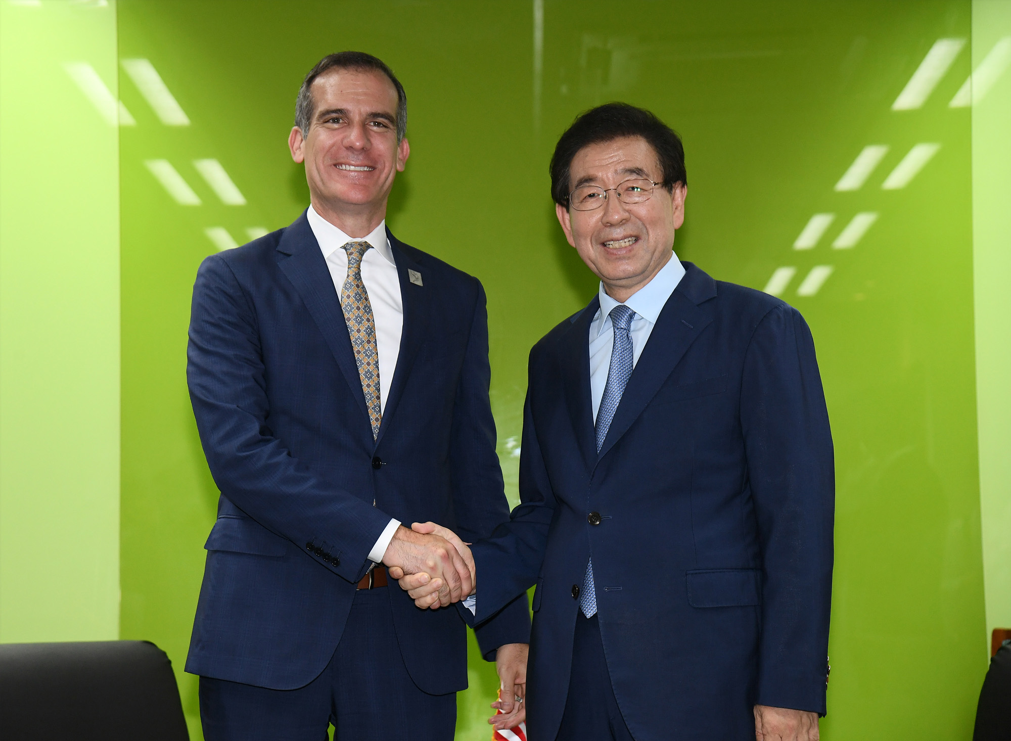 박원순 서울시장이 26일 에릭 가세티 미국 로스엔젤레스(LA)시장과 만나 공동 관광마케팅 협약을 맺고 관광, 기후변화, 성평등 등 다양한 분야에서 협력을 약속했다. 서울시 제공