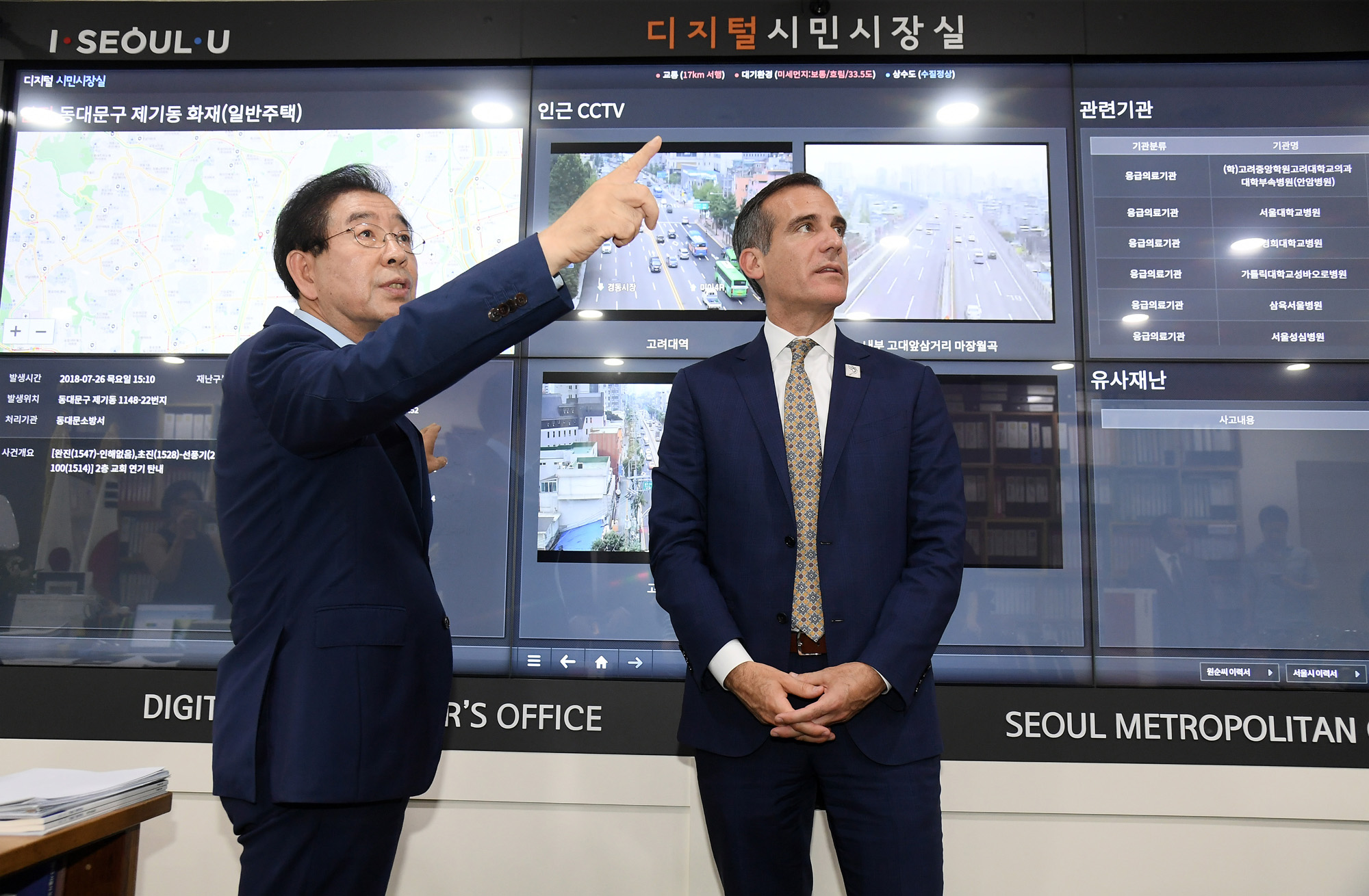 박원순 서울시장이 26일 에릭 가세티 미국 로스엔젤레스(LA)시장과 만나 공동 관광마케팅 협약을 맺고 관광, 기후변화, 성평등 등 다양한 분야에서 협력을 약속했다. 서울시 제공