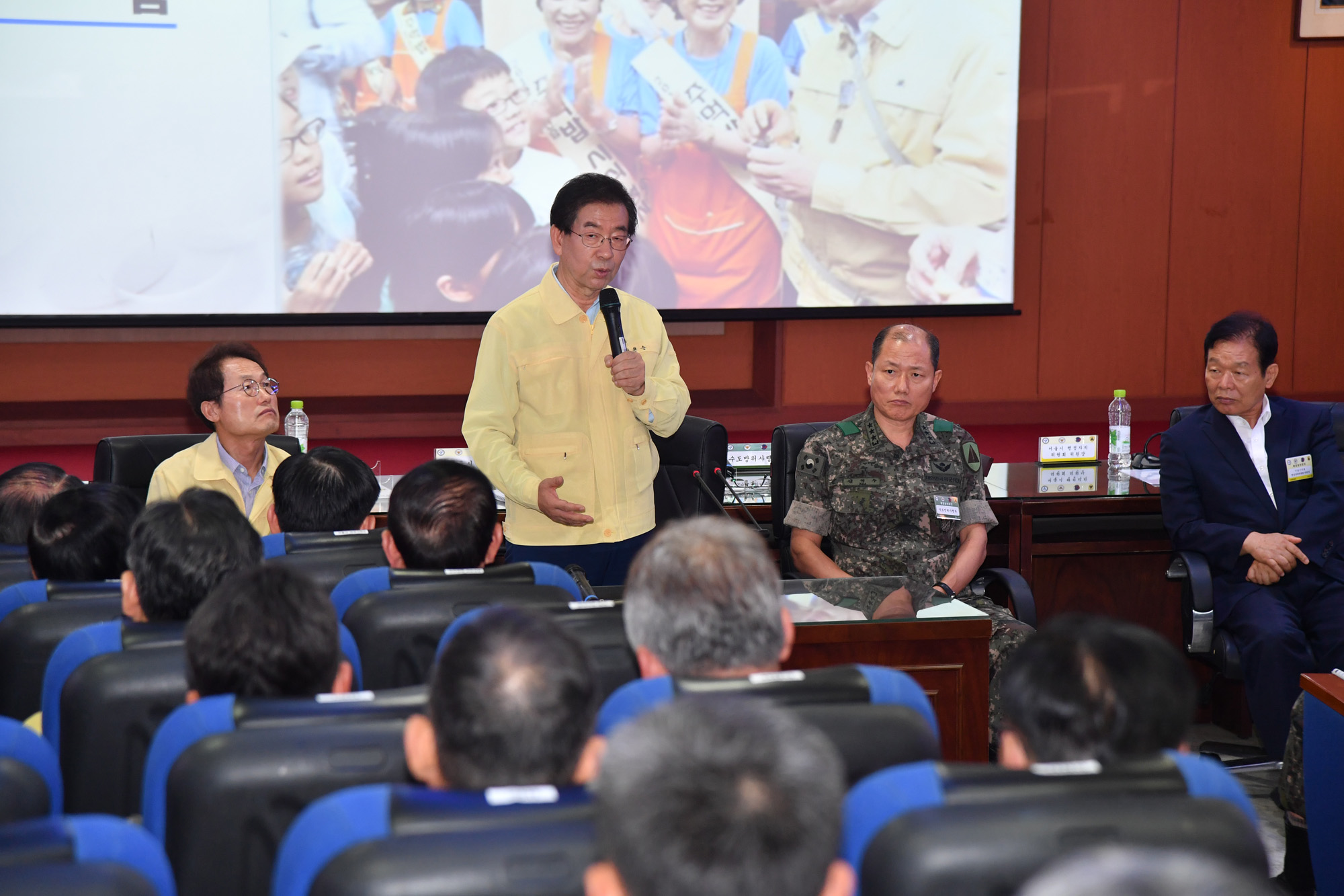박원순 서울시장이 26일 오전 서울 수도방위사령부에서 열린 '2018년 하반기 서울시 통합방위회의'에서 김정수 수도방위사령관에게 감사패를 전달하고 있다. 서울시 제공