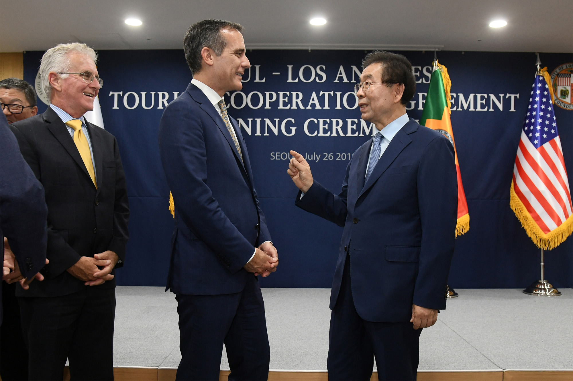 박원순 서울시장이 26일 에릭 가세티 미국 로스엔젤레스(LA)시장과 만나 공동 관광마케팅 협약을 맺고 관광, 기후변화, 성평등 등 다양한 분야에서 협력을 약속했다. 서울시 제공