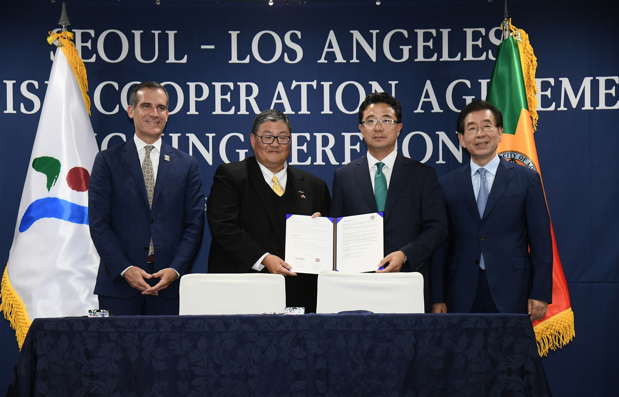 박원순 서울시장이 26일 에릭 가세티 미국 로스엔젤레스(LA)시장과 만나 공동 관광마케팅 협약을 맺고 관광, 기후변화, 성평등 등 다양한 분야에서 협력을 약속했다. 서울시 제공