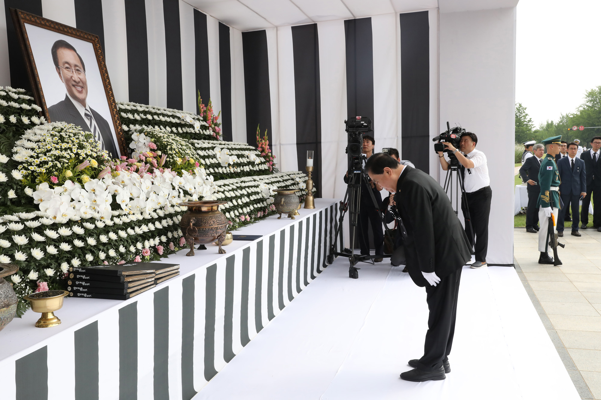 27일 오전 국회에서 열린 고 노회찬 의원 영결식에서 문희상 국회의장이 헌화후 묵념하고 있다.